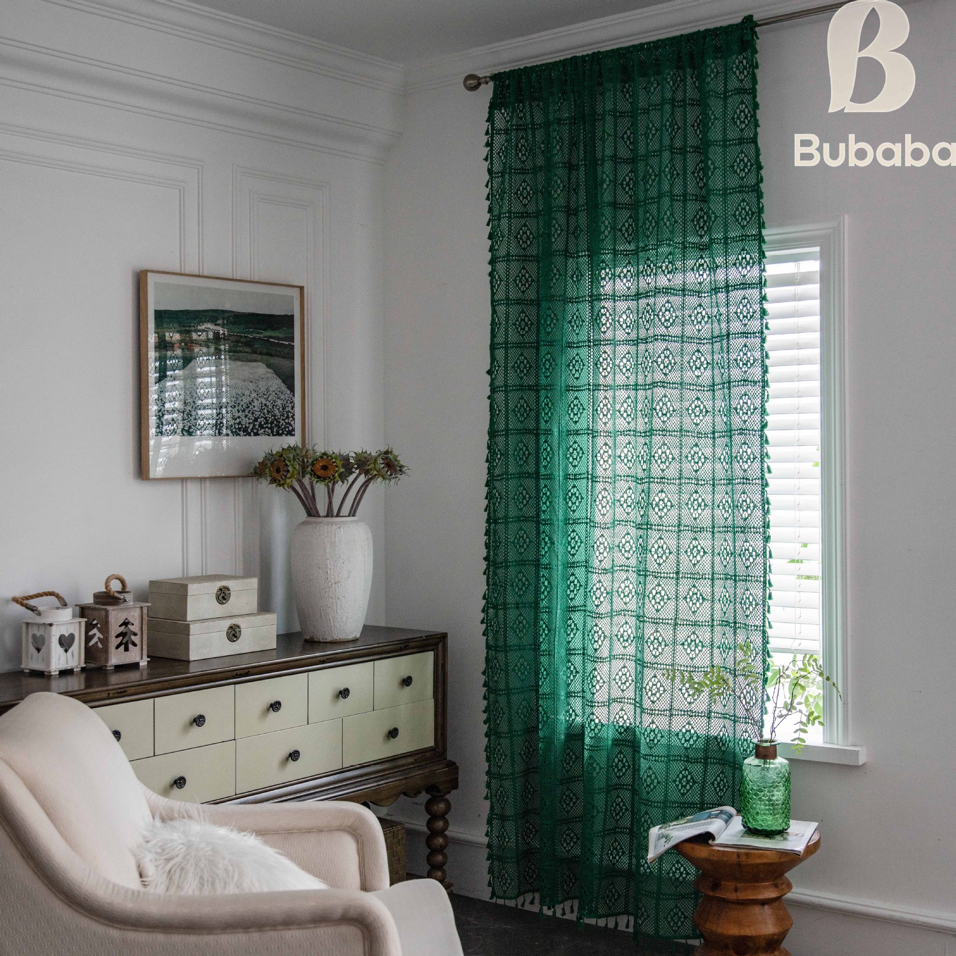 Главная страница > Зеленые затемняющие полупрозрачные шторы с лоскутным узором, ажурной вязкой крючком и застежкой-липучкой для боковых окон гостиной, готовые шторы.