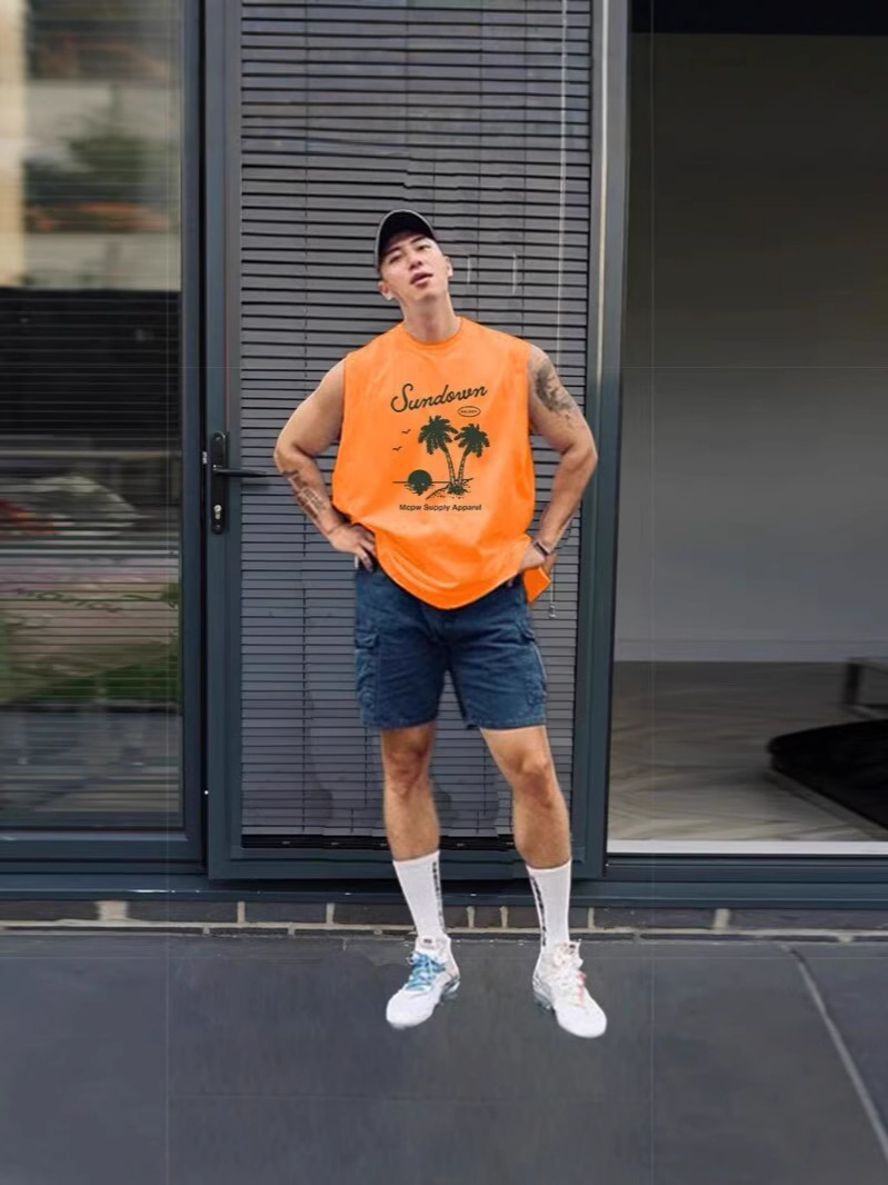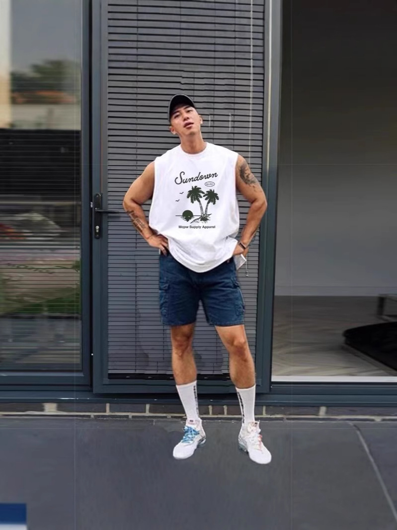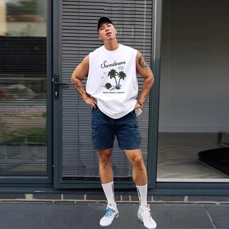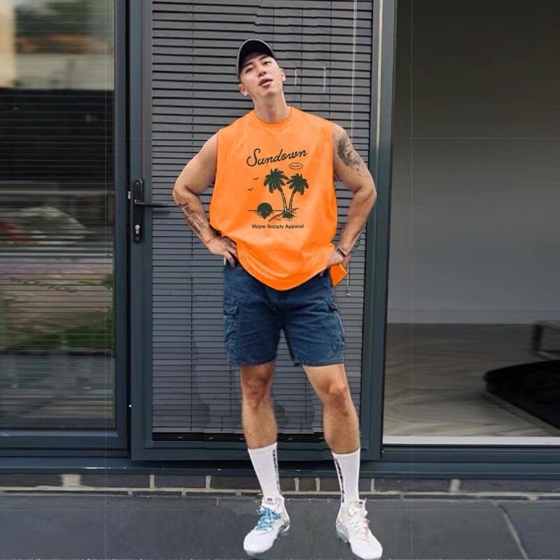 Главная страница > Летняя футболка без рукавов для кемпинга, мужской повседневный летний жилет с круглым вырезом, американский топ, модный брендовый принт, универсальный