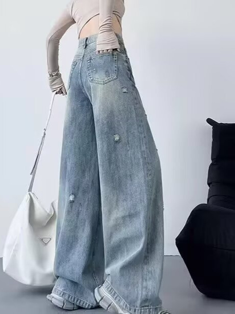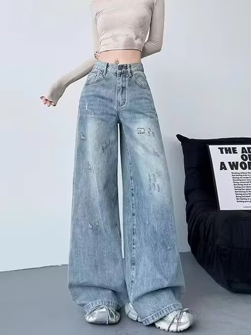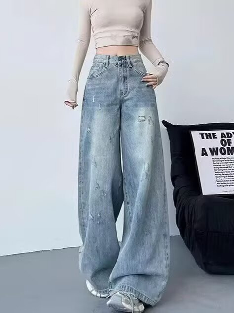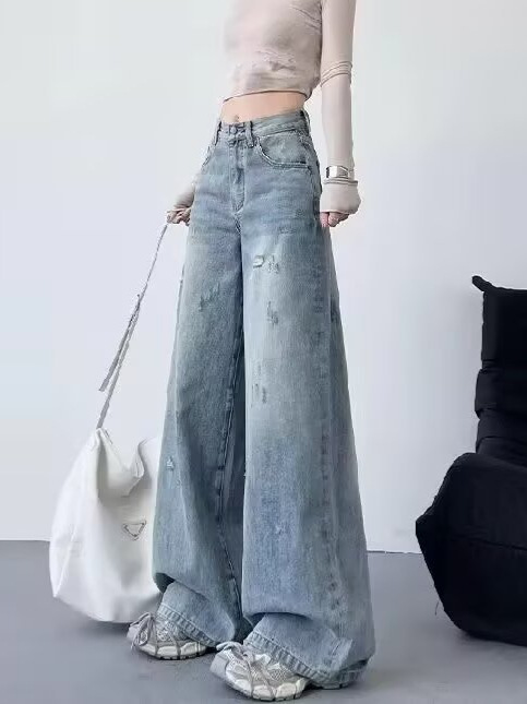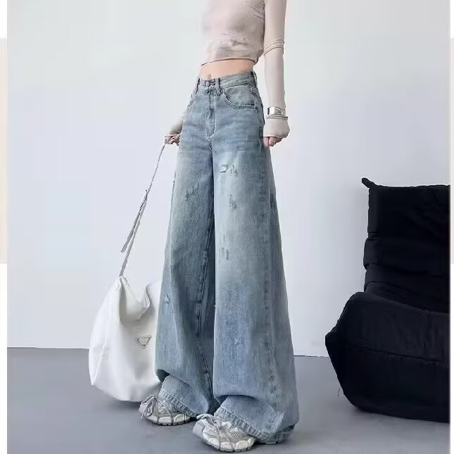 Главная страница > High Street Ретро вымытые джинсы для мытья пола женские летние свободные с высокой талией тонкие дикий дизайн широкие ноги прямые брюки