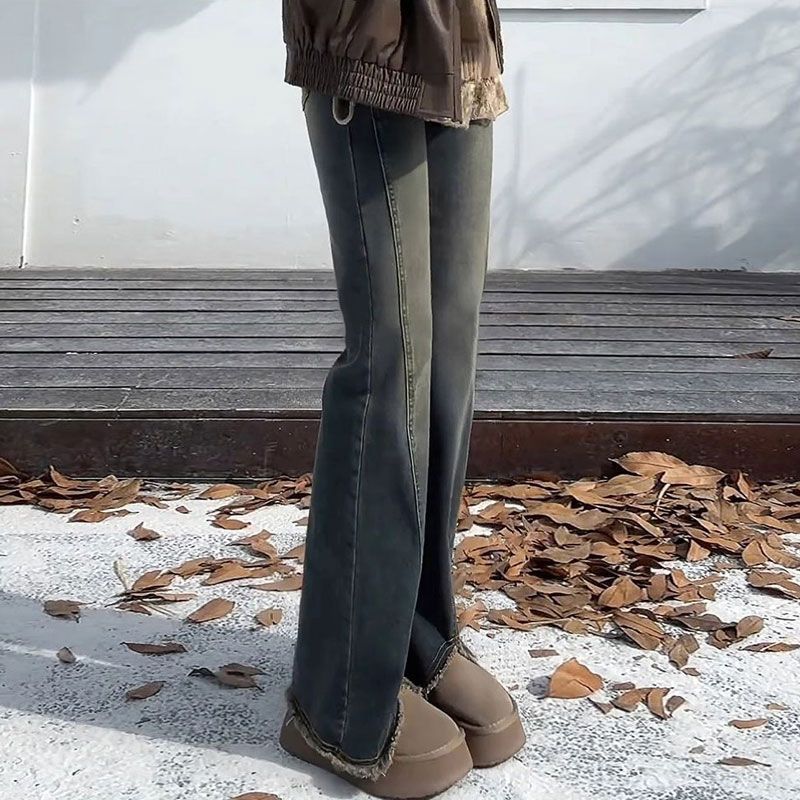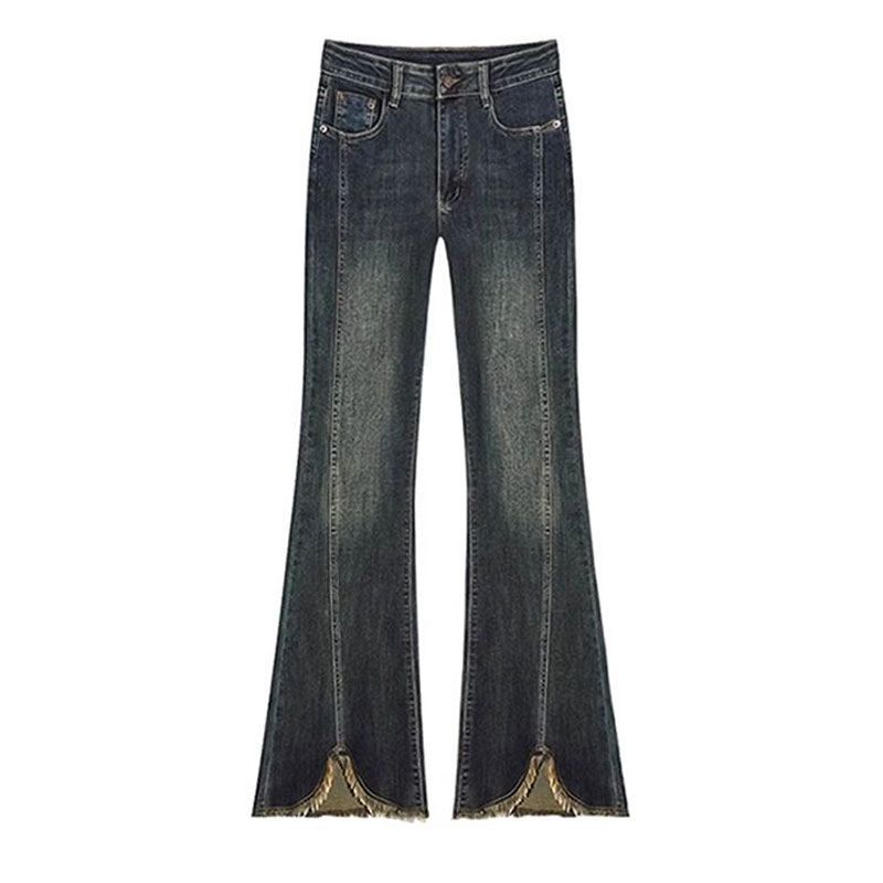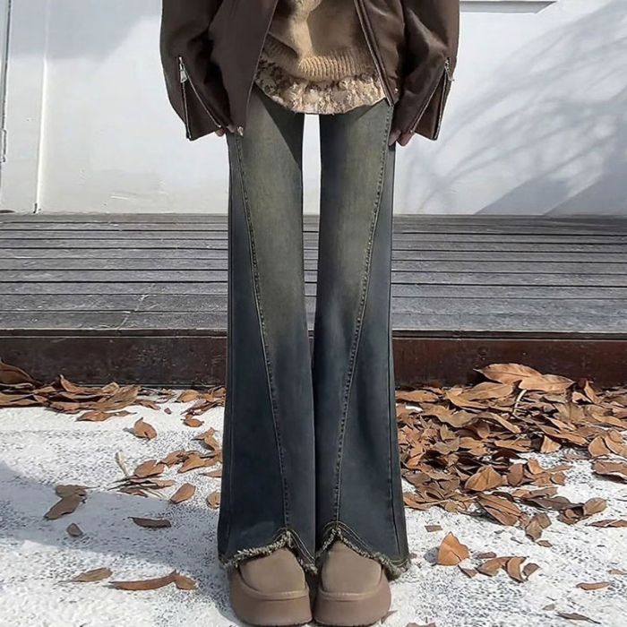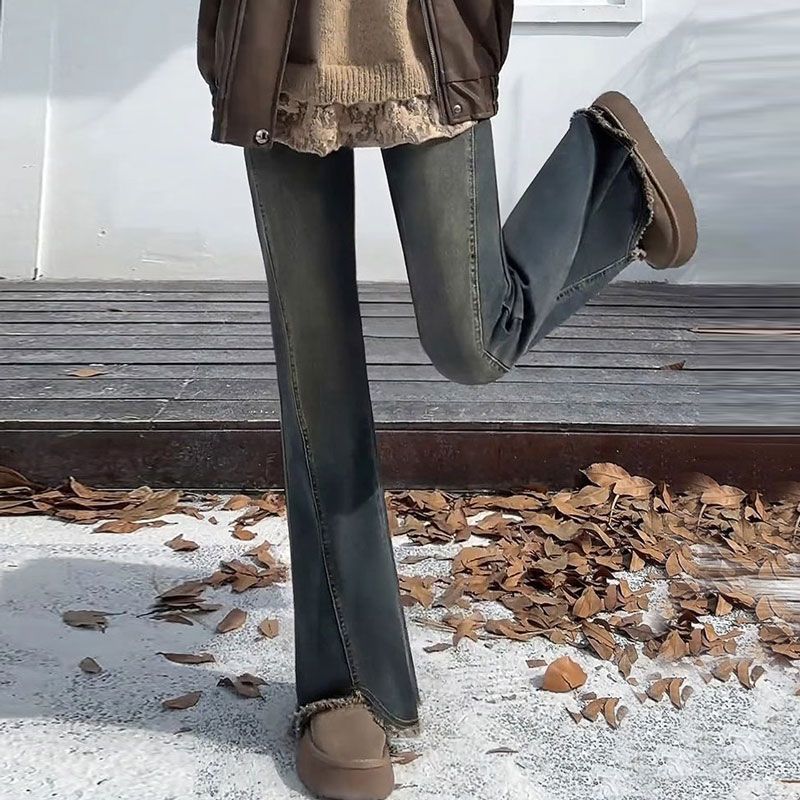 Главная страница > Цементно-серые джинсы с необработанными краями для женщин, летние новые большие размеры, толстые мм, с высокой талией, утягивающие бедра, эластичные расклешенные брюки