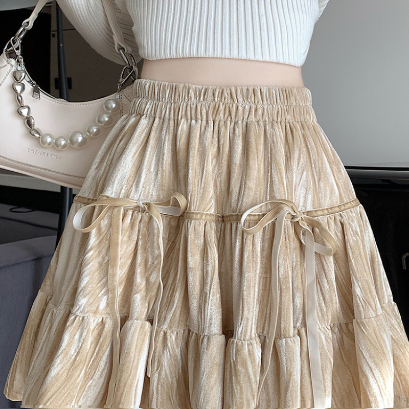 Черная золотая бархатная юбка для торта Юбка Юбка Женская осень Зима 2024 новая эластичная и высокая талия тонкая пушистая юбка