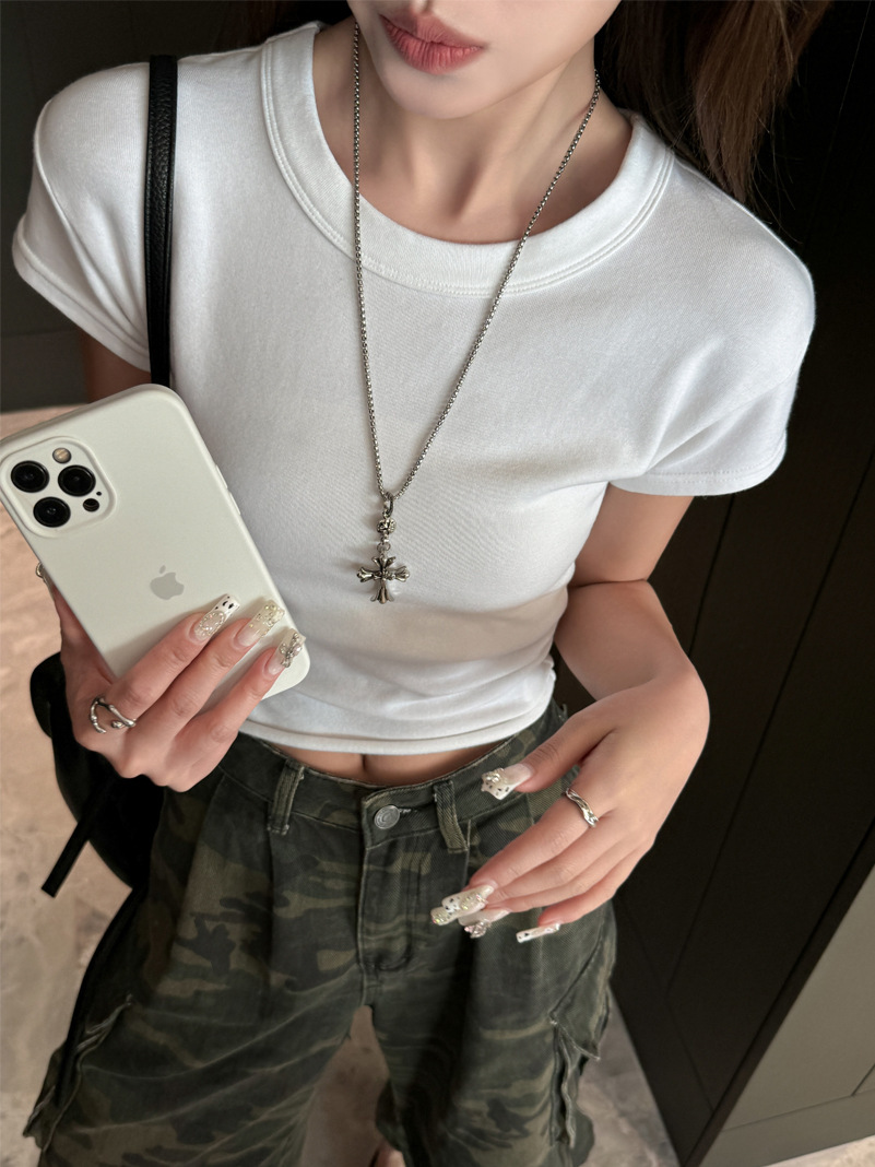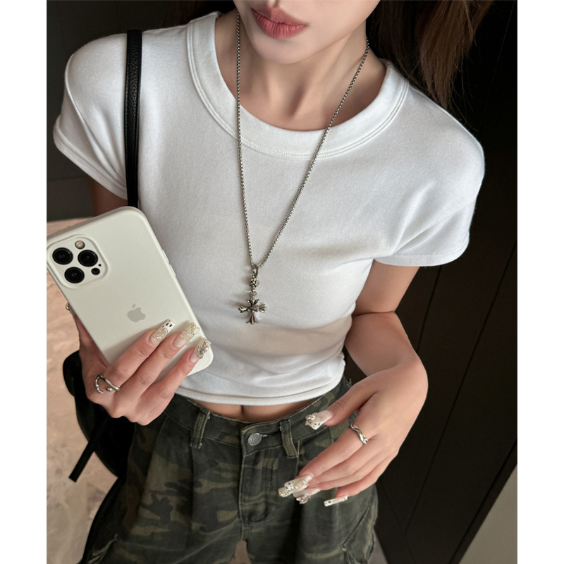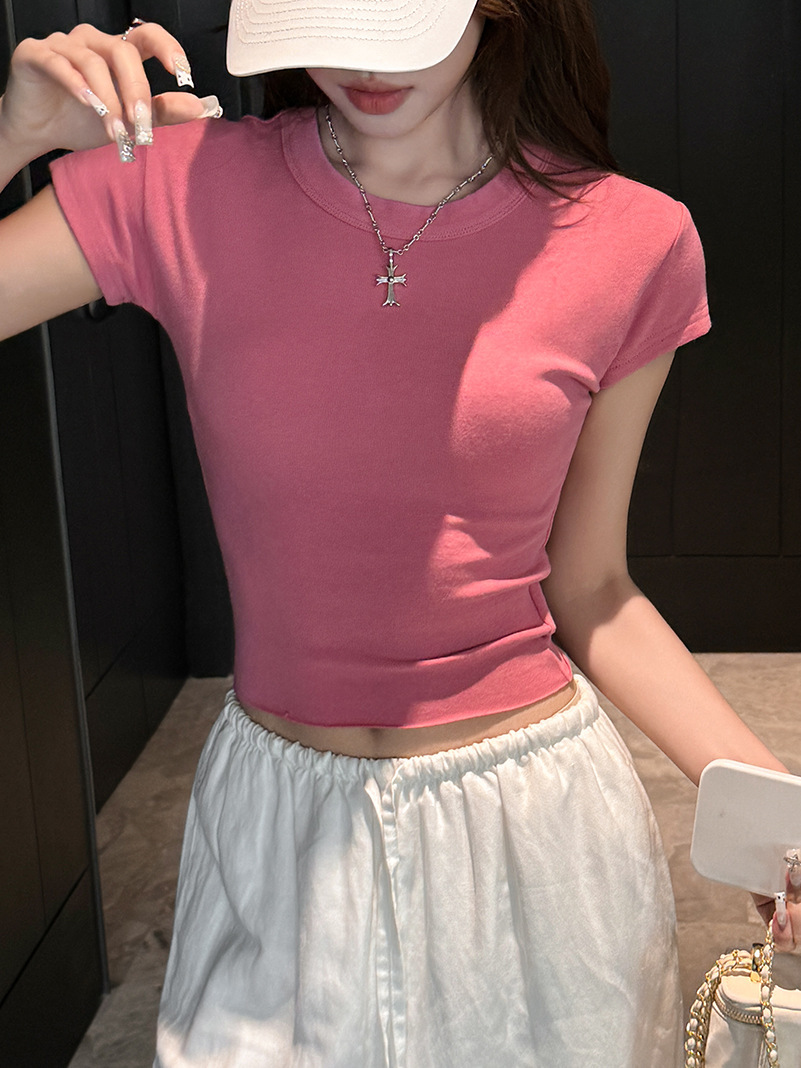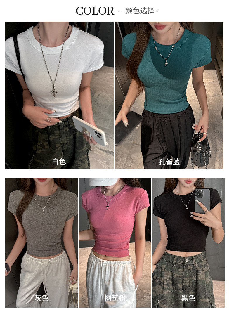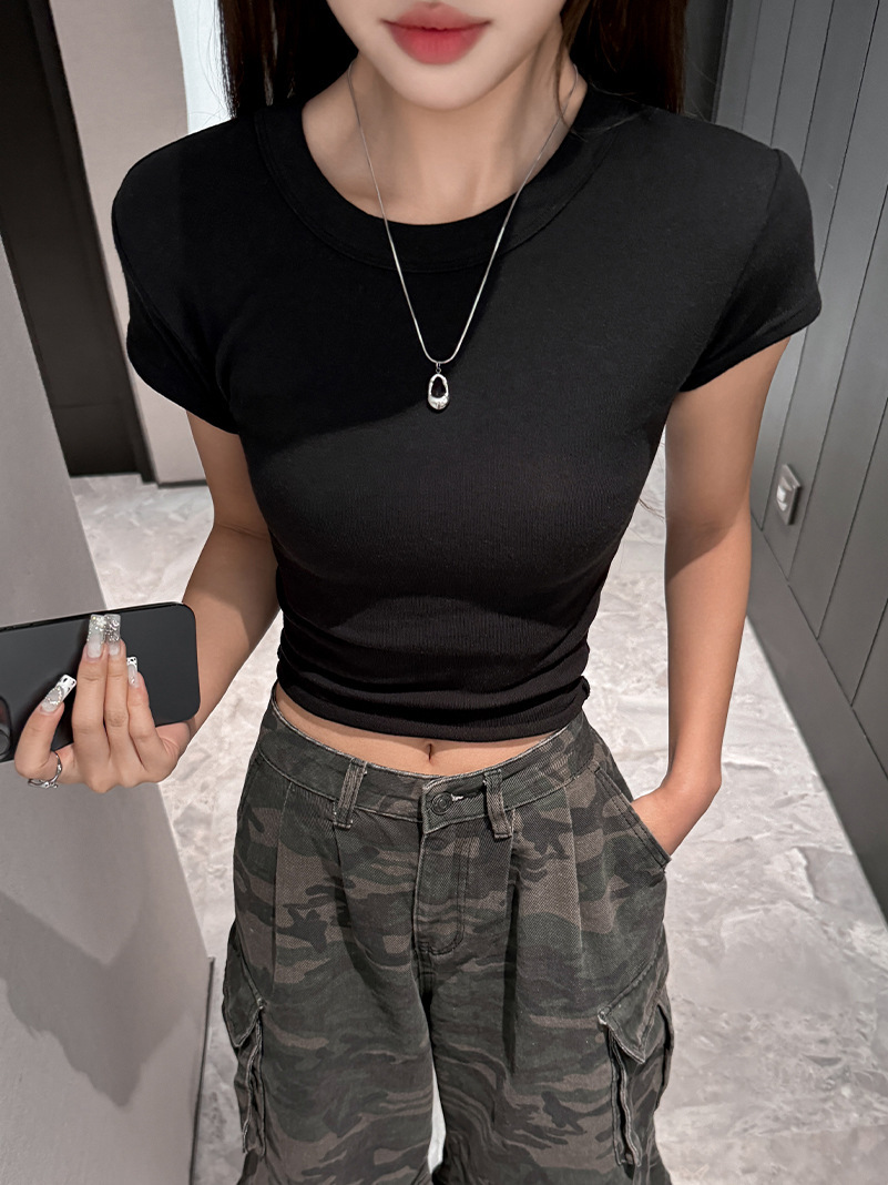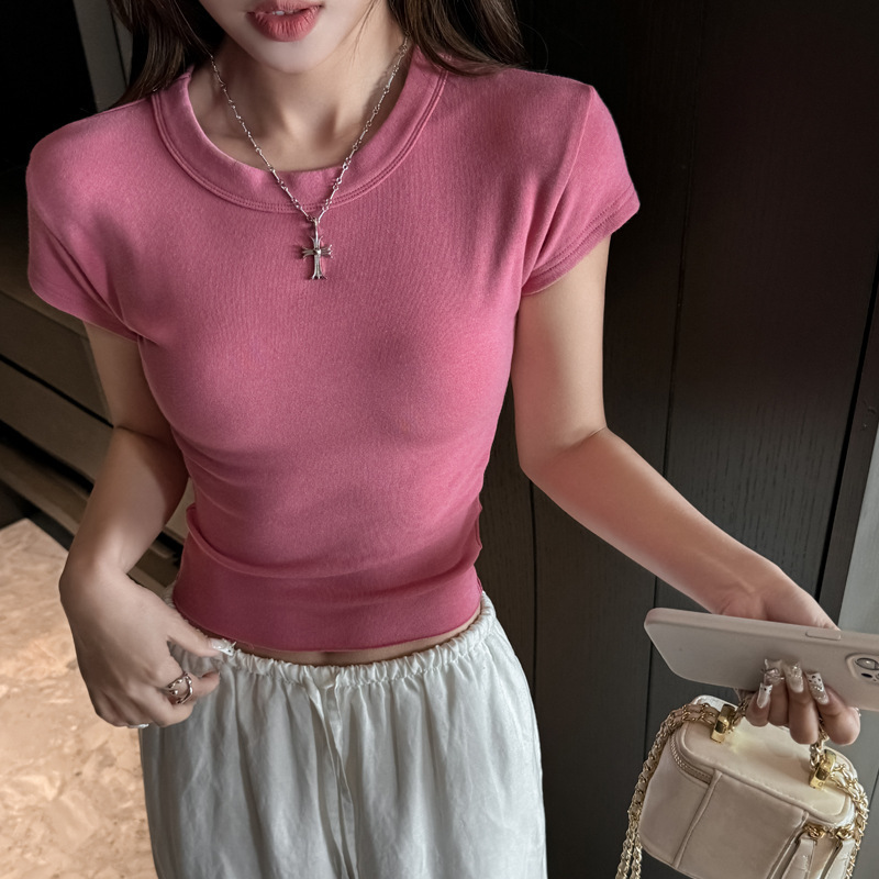 Главная страница > Высококачественная короткая футболка из искусственного кашемира для девочек с круглым вырезом и правым плечом, женская летняя футболка с короткими рукавами для похудения, корейский женский топ