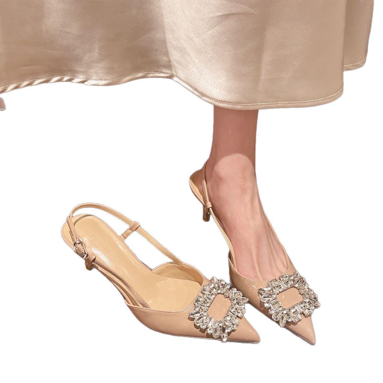 Женские остроконечные босоножки на высоком каблуке с квадратной пряжкой и стразами во французском стиле, каблук-шпилька, новый летний стиль 2025 года, туфли с закрытым носком и открытой спиной в стиле Chanel.