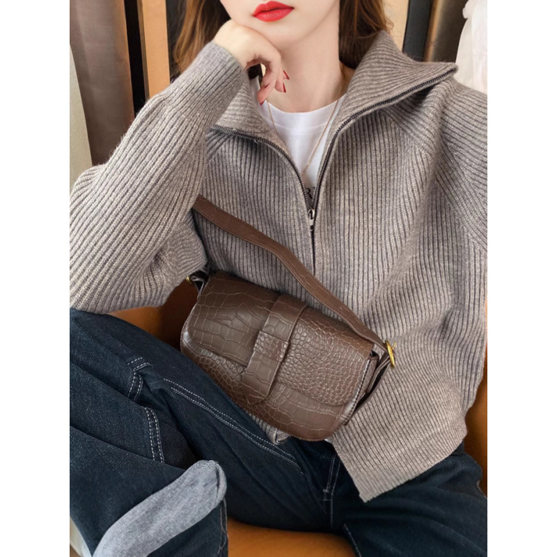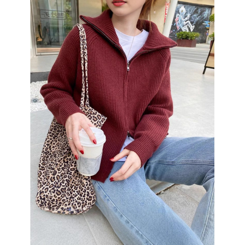 2024 осень и зима новый кардиган с отворотом на молнии куртка женский корейский свободный свитер в полоску свитер короткий