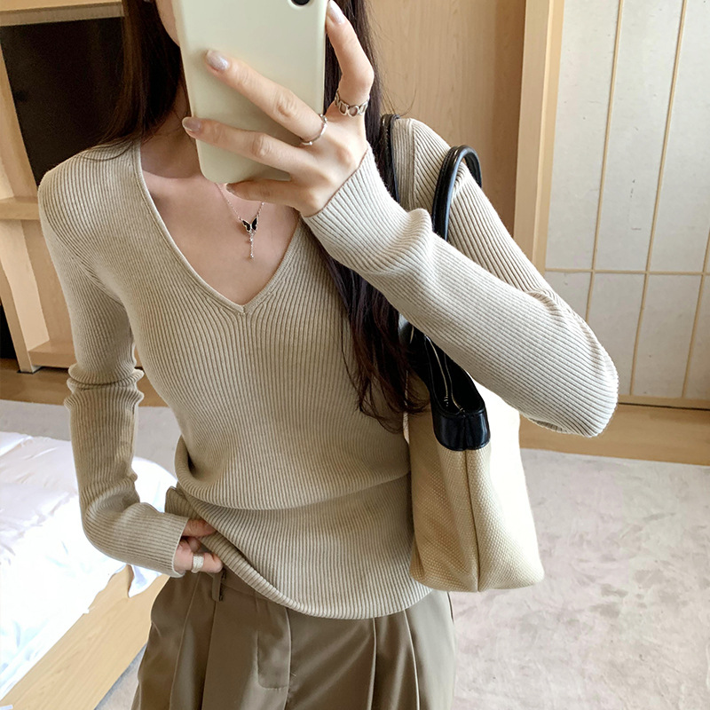 Главная страница > Дикий иностранный V-образный вырез с длинными рукавами трикотажная нижняя рубашка женская 2024 осень и зима новая мягкая восковая кожа тонкий топ