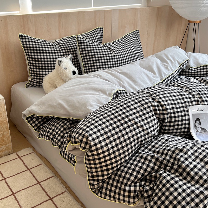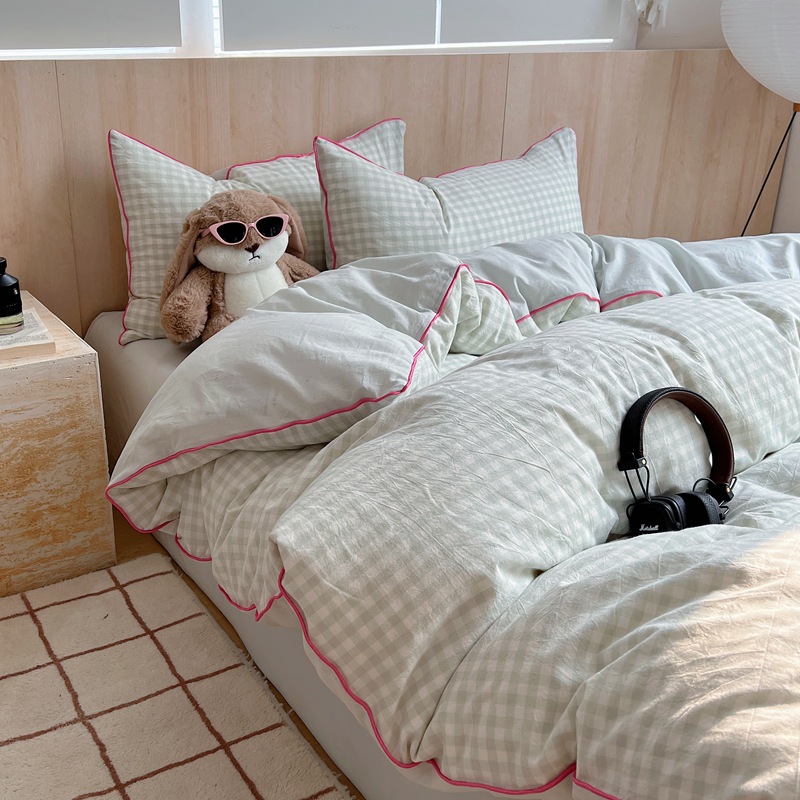 Главная страница > Свежий маленький клетчатый комплект из чистого хлопка в японском стиле, состоящий из четырех предметов, с встроенным шнуром, полностью хлопковый пододеяльник, простая девчачья простыня с сердечками