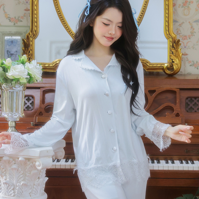 Главная страница > Кардиган из модала с длинными рукавами и лацканами, пижамный комплект, свободная, удобная и милая домашняя одежда с кружевной строчкой и бантом для женщин