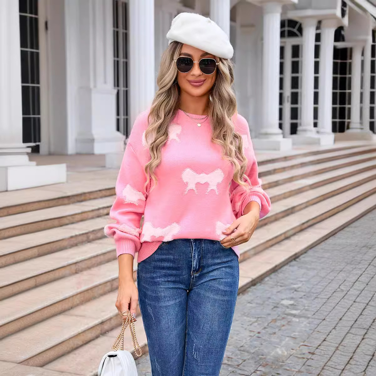 Главная страница > Новый модный вязаный свитер с круглым вырезом и бантом, длинный рукав, тренд 2025 года, хит продаж на Amazon, европейский и американский стиль