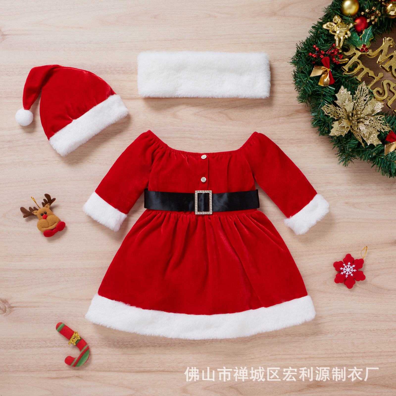 Главная страница > Детская одежда для девочек в европейском и американском стиле: комплект из трех предметов — золотая бархатная юбка с длинными рукавами, меховой вставкой, поясом и шапкой для праздника Рождества.