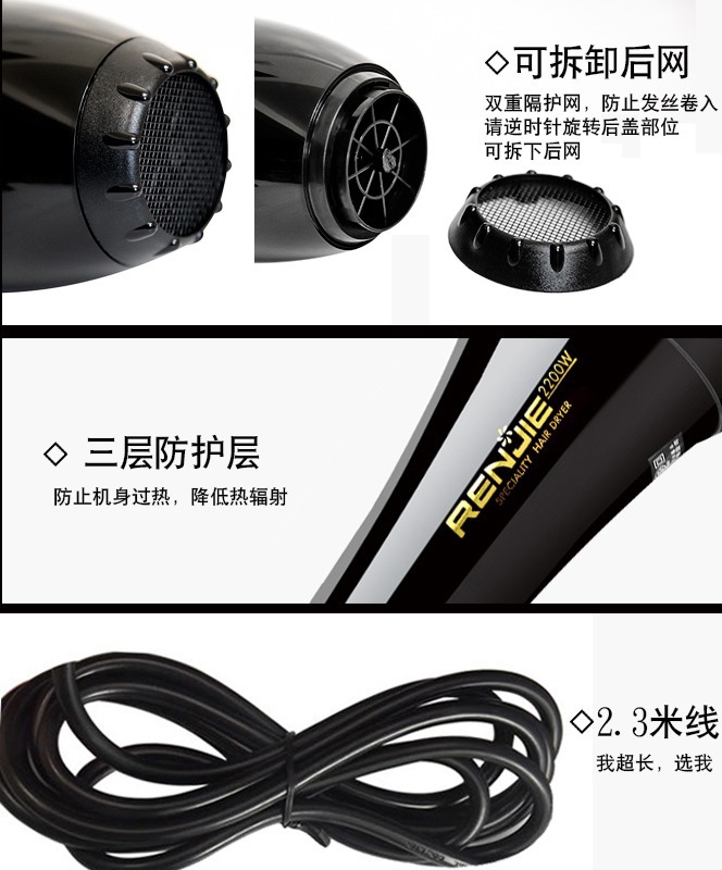 Renjie 827 Домашняя Высокая мощность 2200 Вт Горячий и холодный ветер Домашняя Парикмахерская Стиль Фен