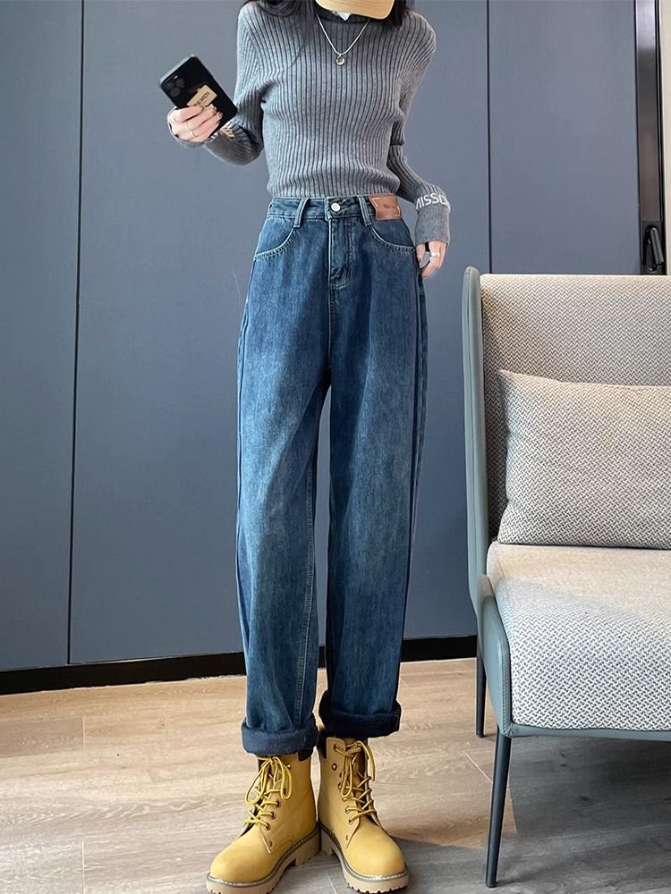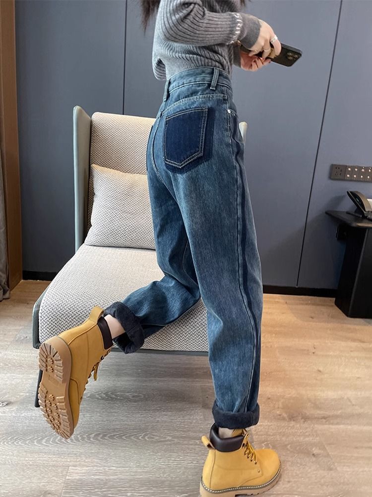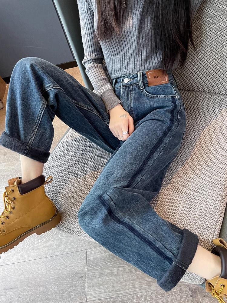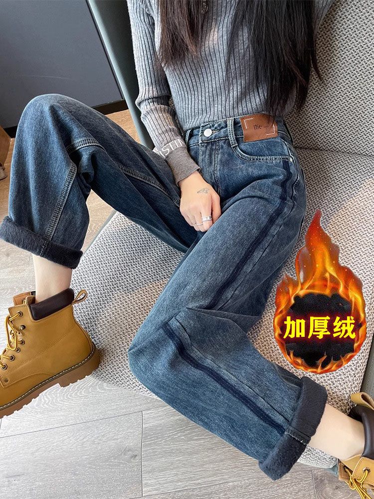 Главная страница > Синие толстые теплые прямые брюки на флисовой подкладке для женщин, пухлые девушки, большие размеры, зимние новые свободные облегающие широкие джинсы с высокой талией