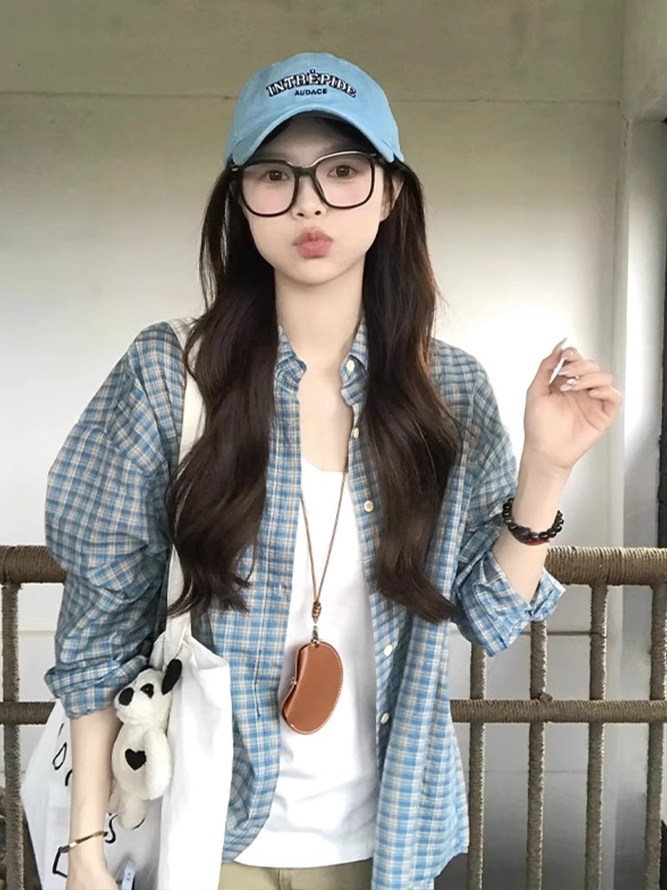 Главная страница > Синий клетчатый воротник с длинными рукавами солнцезащитная рубашка женская летняя тонкая верхняя рубашка дикий повседневный топ