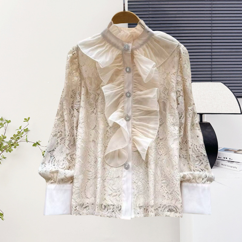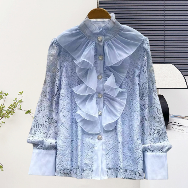 Главная страница > Уникальная и шикарная женская блузка с рюшами и бриллиантами, воротником-стойкой, расклешенными рукавами, однобортная, однотонная, милый топ.