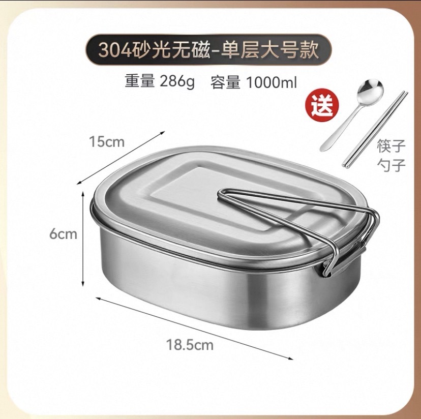 Однослойный ланч-бокс 304 [большой размер] поставляется с ложкой и палочками для еды.