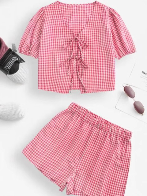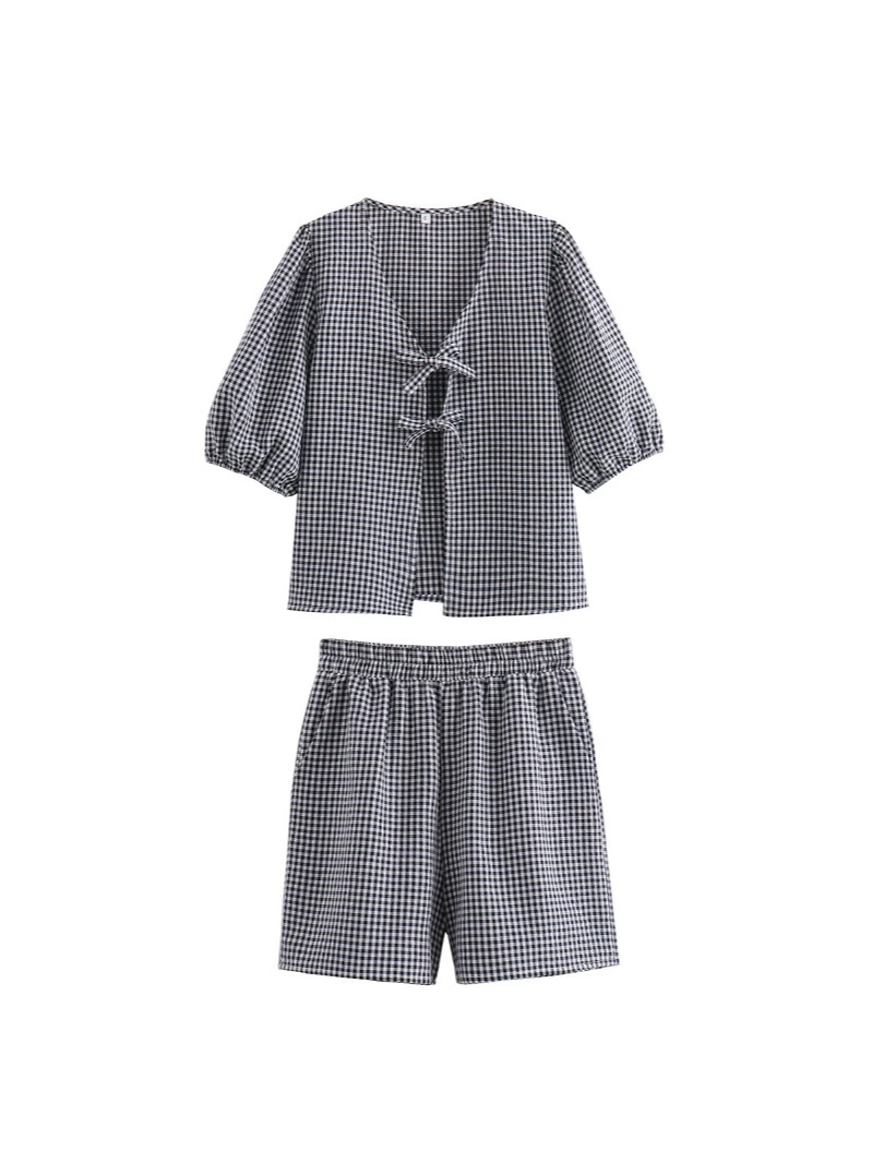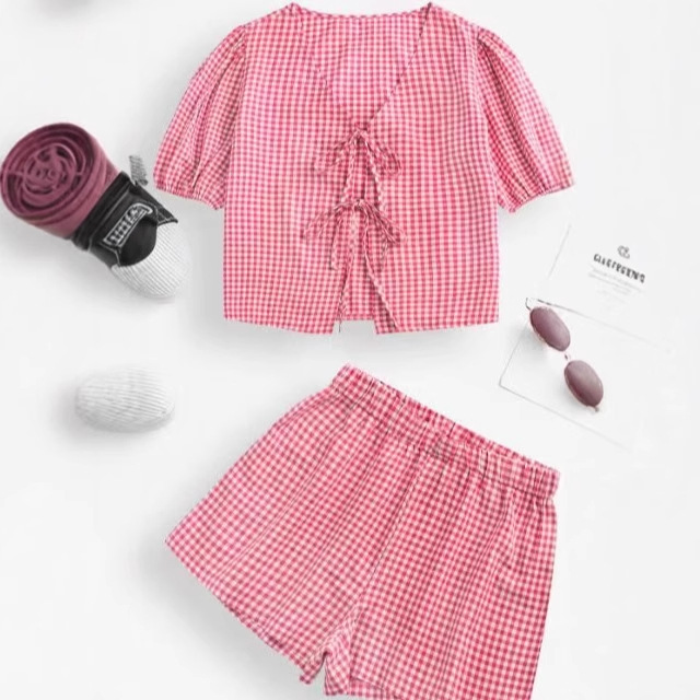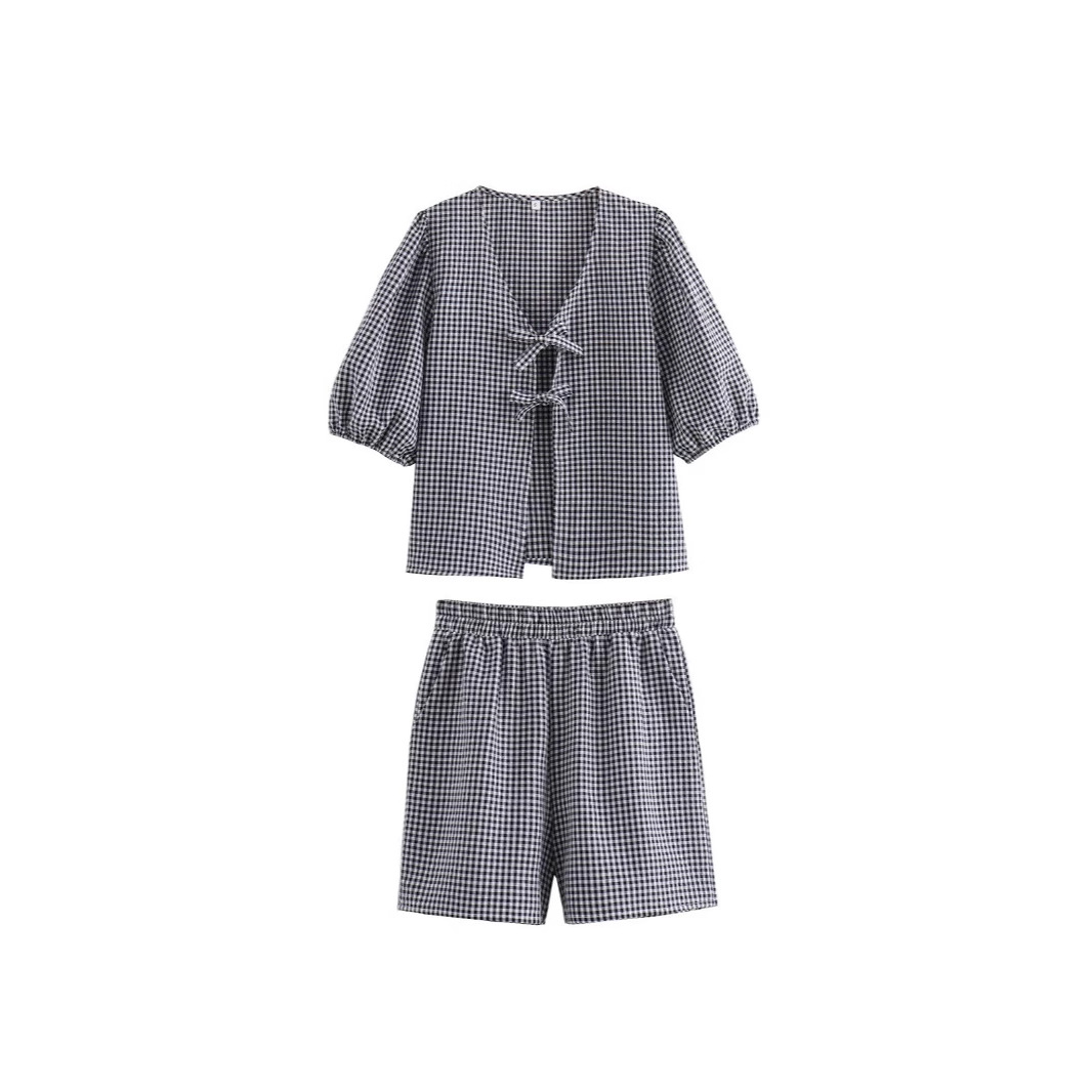 Главная страница > Летний костюм для женщин 2025 года, европейско-американский стиль, кружевной топ в клетку, повседневный элегантный свободный крой, брюки с высокой талией и широкими штанинами