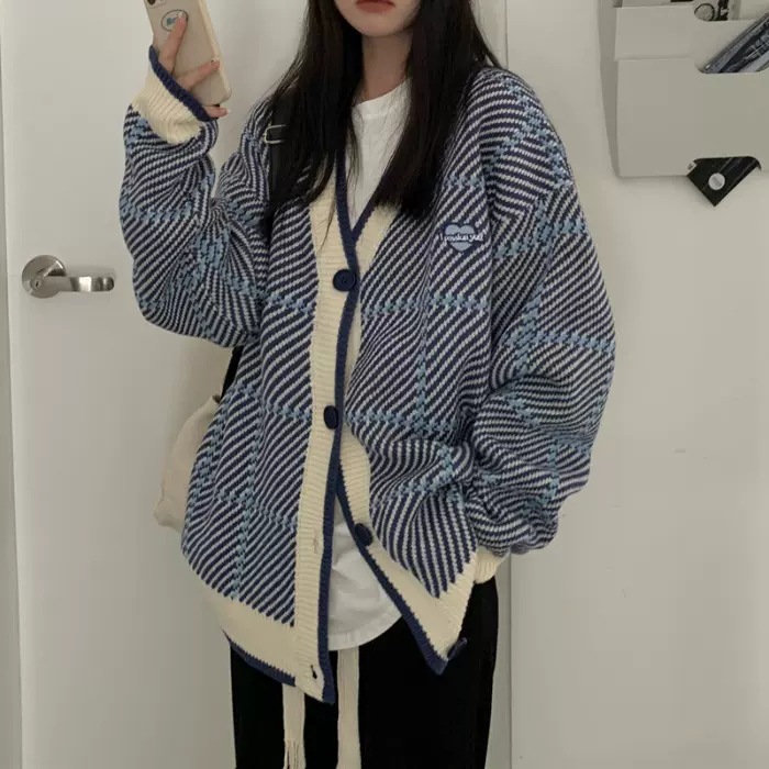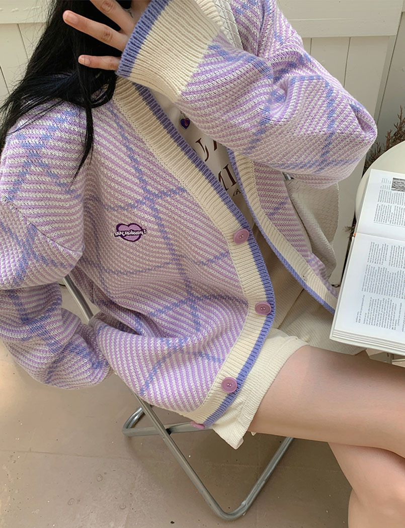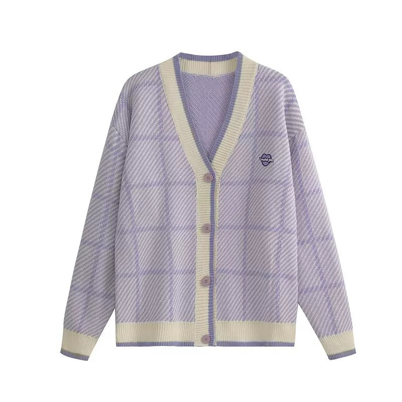 Главная страница > Весенне-осенний фиолетовый свитер в шахматную клетку с вышивкой, женский мягкий восковой свободный корейский стиль, утолщенная вязаная куртка в ленивом стиле