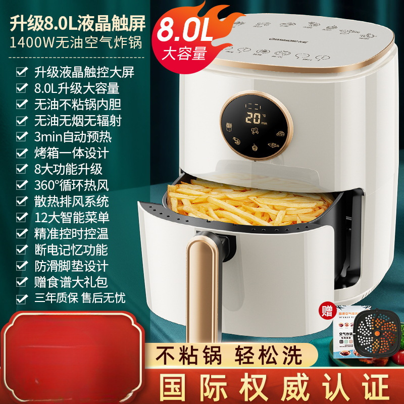 [Верхний сенсорный ЖК-экран/белый 8,0 л] Высокая огневая мощь 1400 Вт + импортный чип + безмасляный антипригарный вкладыш + 8 основных обновленных функций