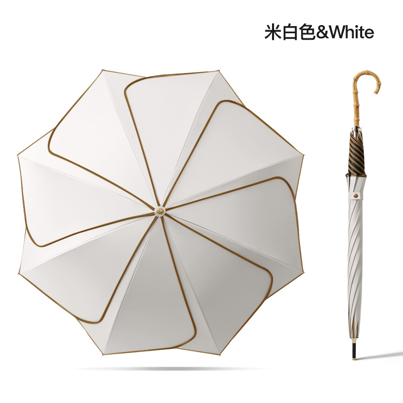 [Кожаная изогнутая ручка] Прямой зонт с 8 лепестками - кремово-белый