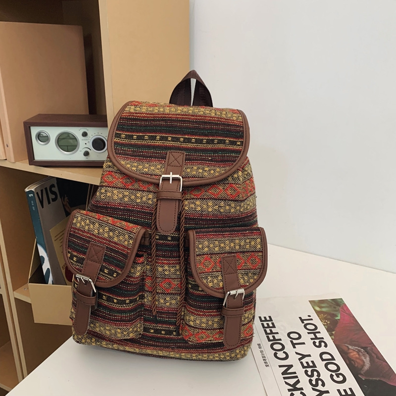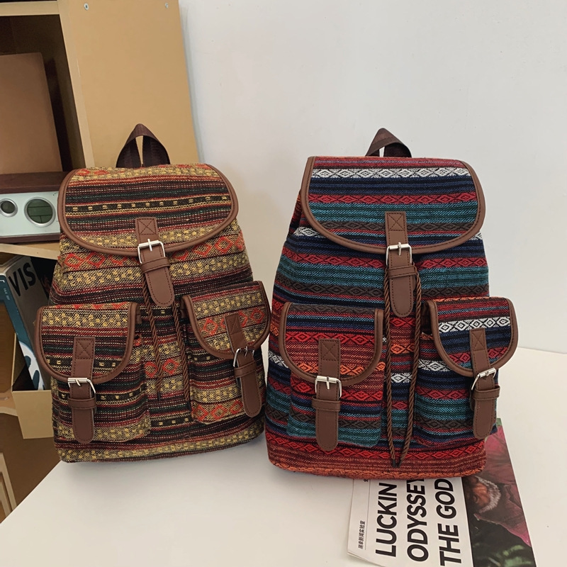 Новинка 2025 года, рюкзак в этническом стиле, повседневный клетчатый рюкзак на шнурке в стиле ретро, женская школьная сумка большой вместимости, сумка-ведро на шнурке