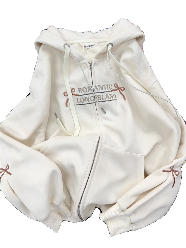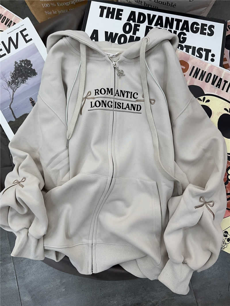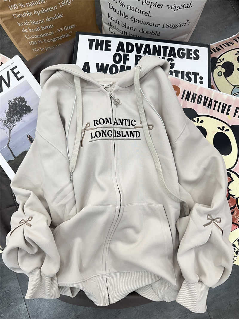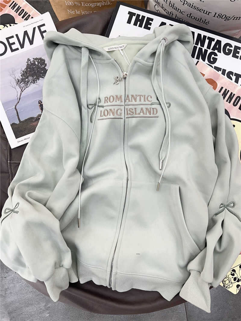 Рукав лук маленький дизайн чувство 2025 весенний свободный кардиган с капюшоном на молнии свитер женский фонарь рукав пальто корейский