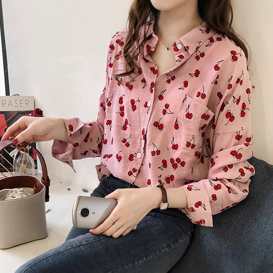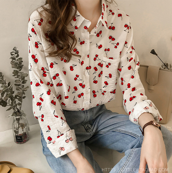 Главная страница > Новая женская рубашка с длинным рукавом для ранней осени, свободная рубашка в корейском стиле с милым принтом вишни, базовая рубашка-топ для ранней осени.