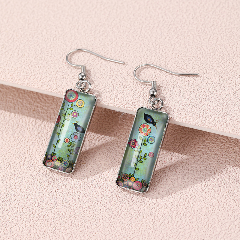 Трансграничные иллюстрации цветов и птиц 2025, крючки для ушей из нержавеющей стали, серьги с синей птицей, серьги с голубем мира, зимние сладкие квадратные серьги с птицами