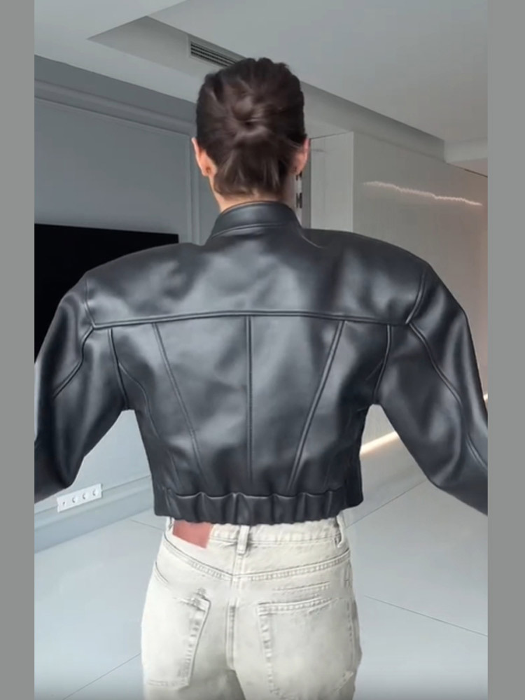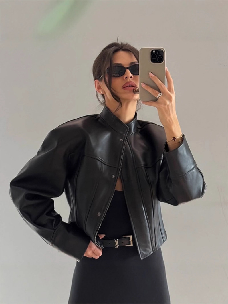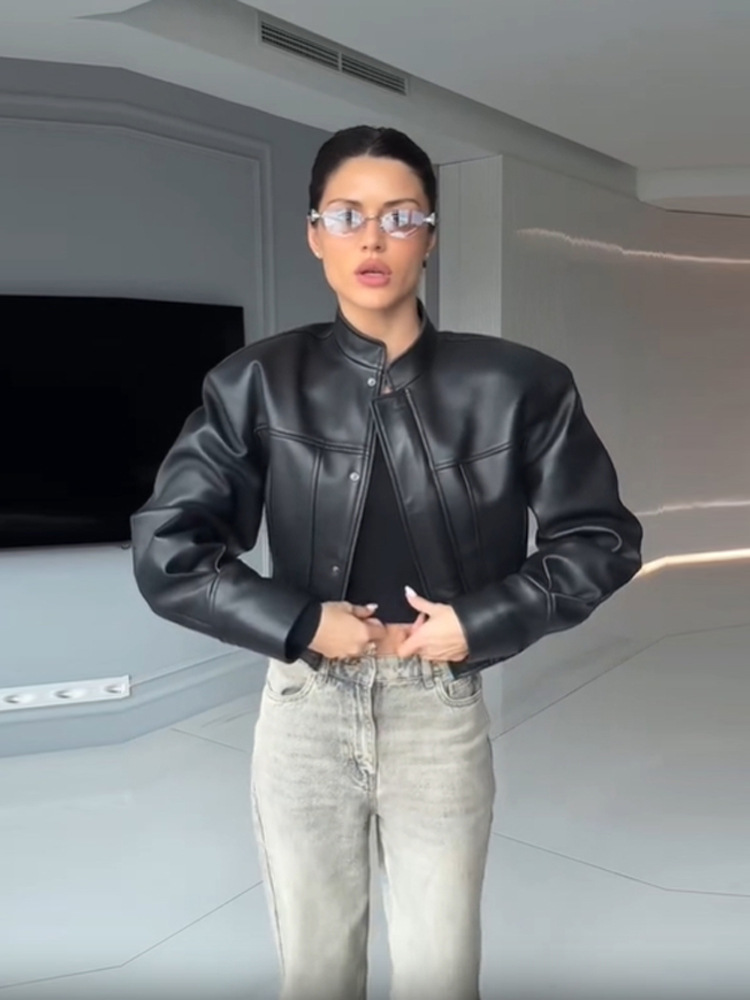 Главная страница > Женская короткая кожаная куртка в стиле ретро, свободного кроя, с воротником-стойкой и завышенной талией, осенняя коллекция 2025 года, европейско-американский стиль.