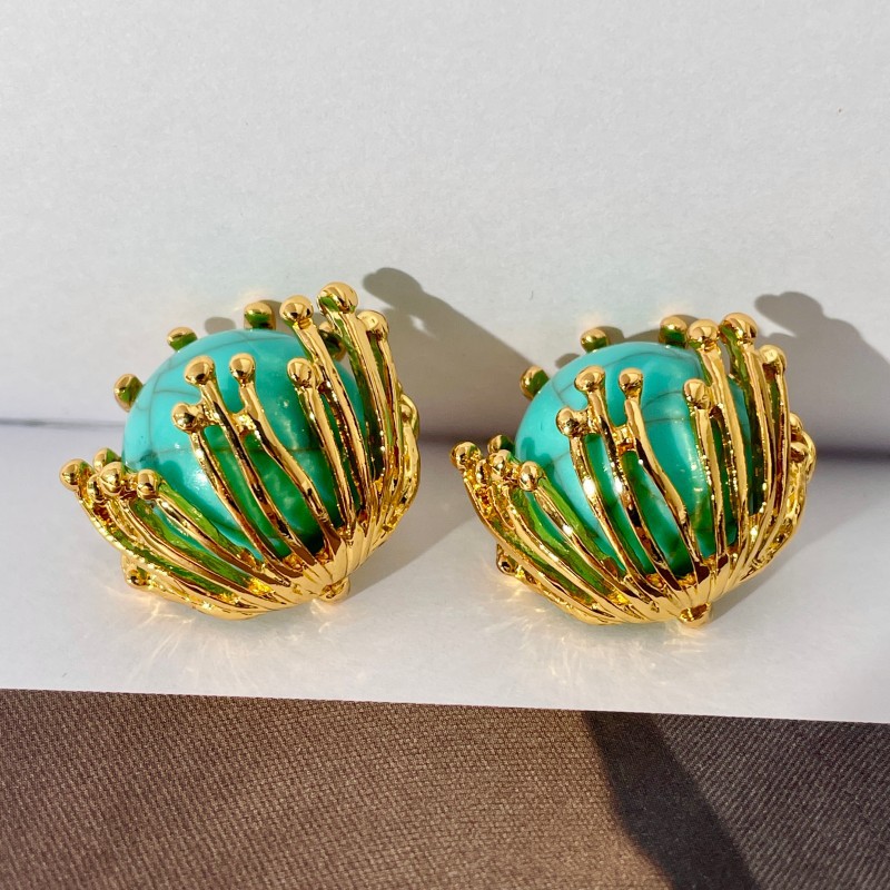 2407138 Круглая бирюзовая ушная пряжка (позолоченная золото)