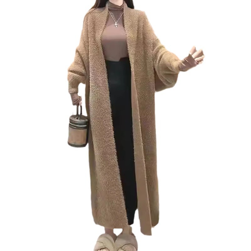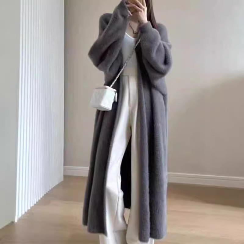 Осенний и зимний колено имитация норкового бархата трикотажный кардиган женский корейский свободный средний длинный ленивый ветер мягкий клейкий свитер куртка женский