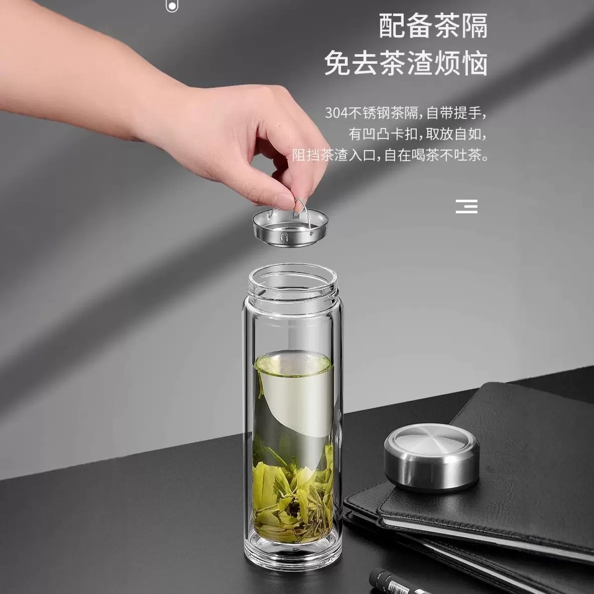 Главная страница > Двухслойная стеклянная чашка для воды из боросиликатного стекла, мужская чашка для чая с разделением воды, портативная чашка для чая, бытовая изолированная чашка для чая