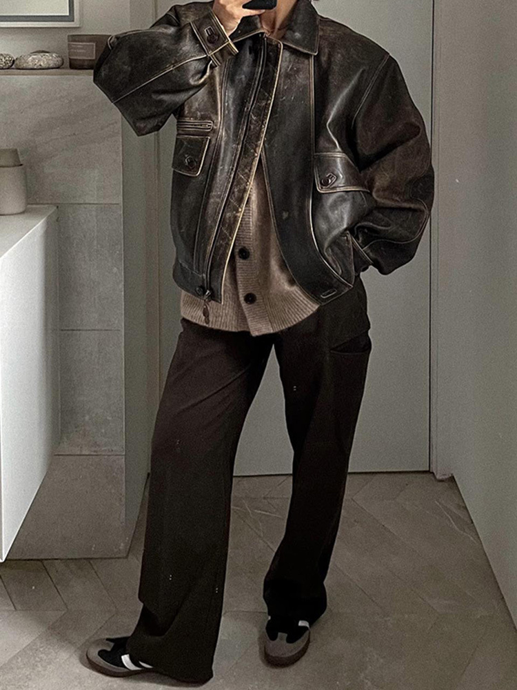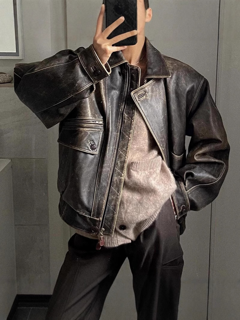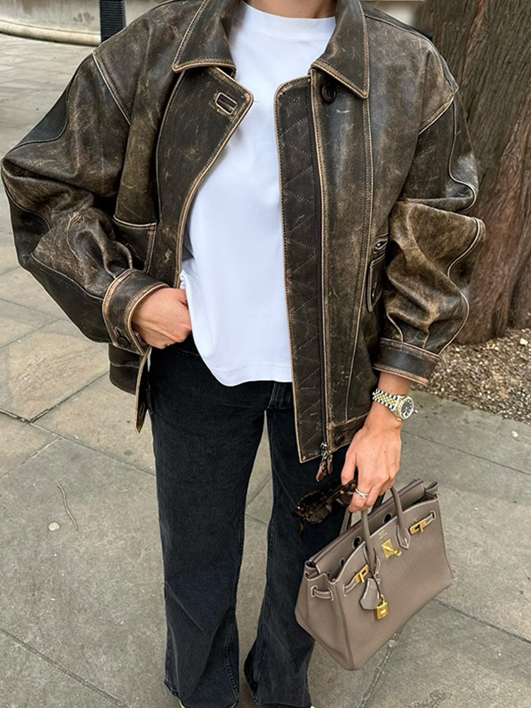 Главная страница > В наличии винтажная кожаная куртка для женщин, весна 2025, новая, кросс-бордер, байкерский воротник, свободный крой