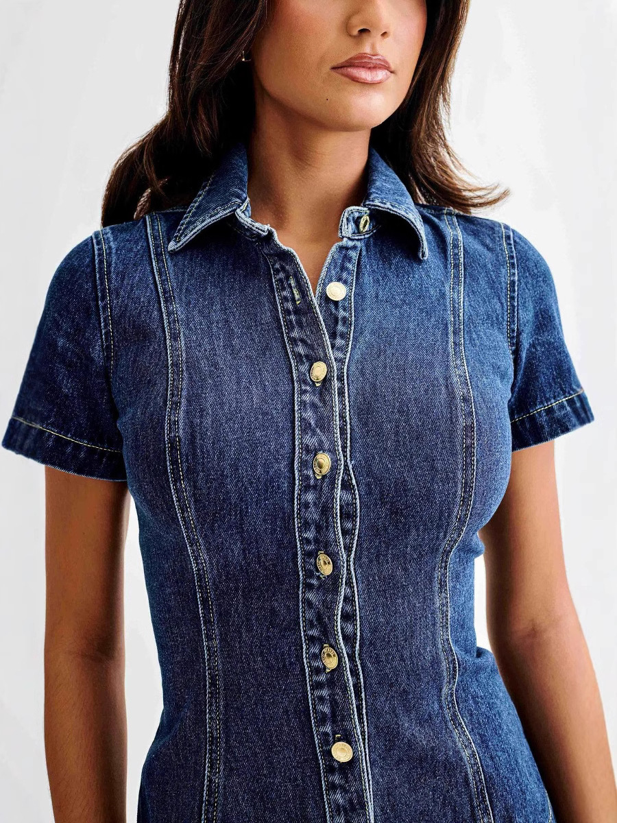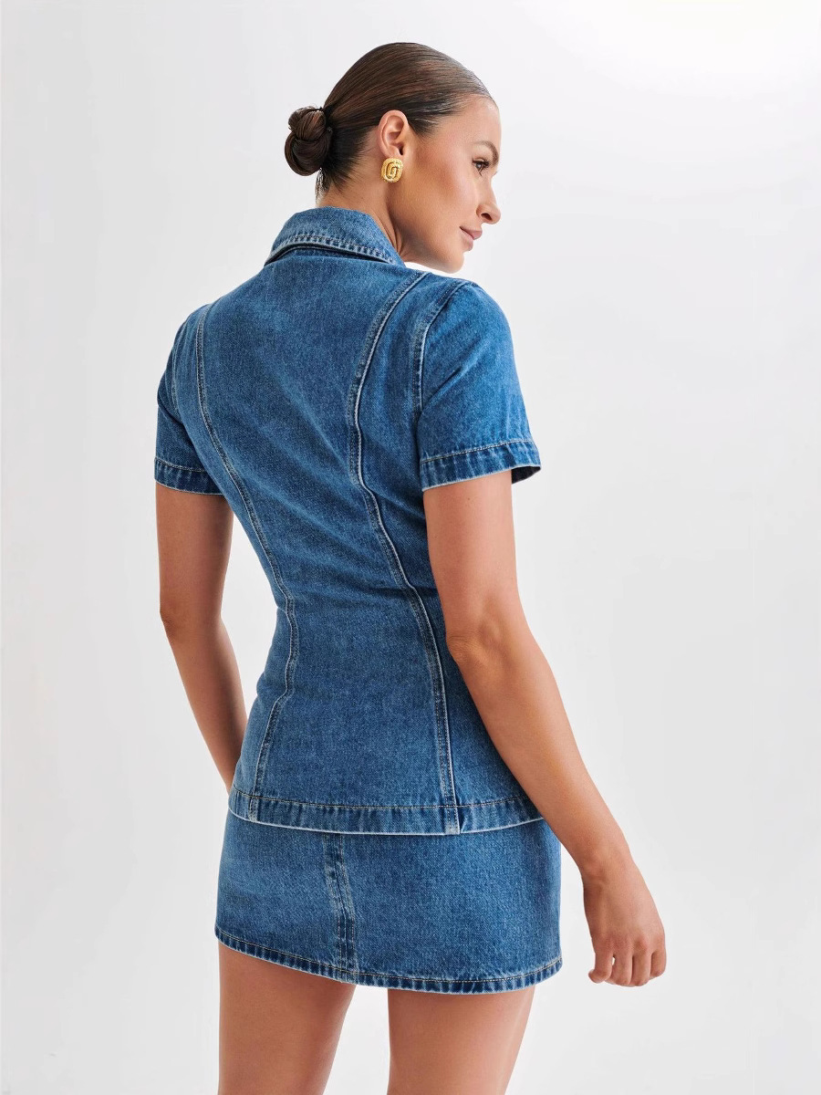 Главная страница > Женский костюм 2025: новый европейско-американский стиль, джинсовая рубашка с коротким рукавом на пуговицах и юбка с высокой талией, облегающий силуэт