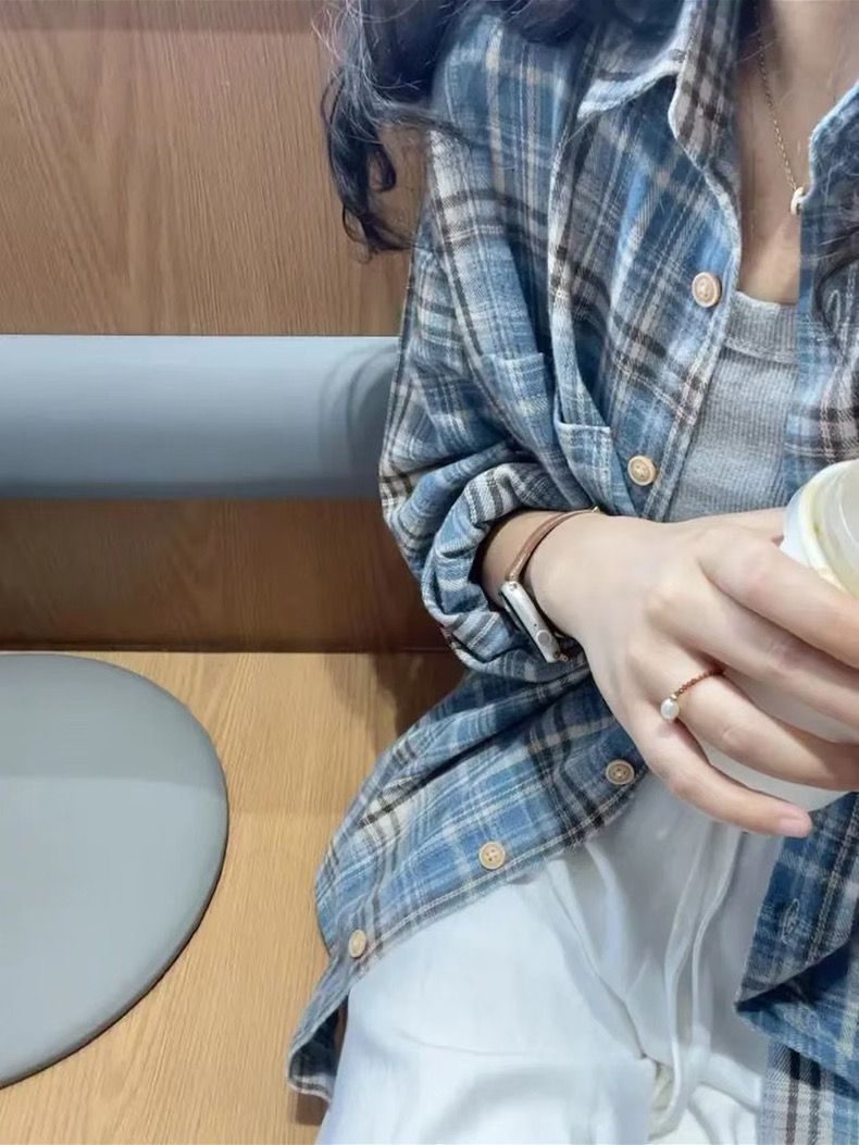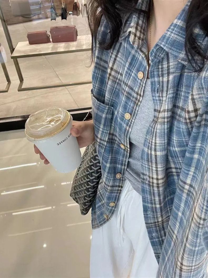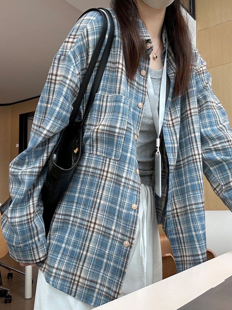 Главная страница > La Chapelle синяя клетчатая куртка-рубашка женская лето 2025 новая свободная куртка в стиле ретро кардиган рубашка