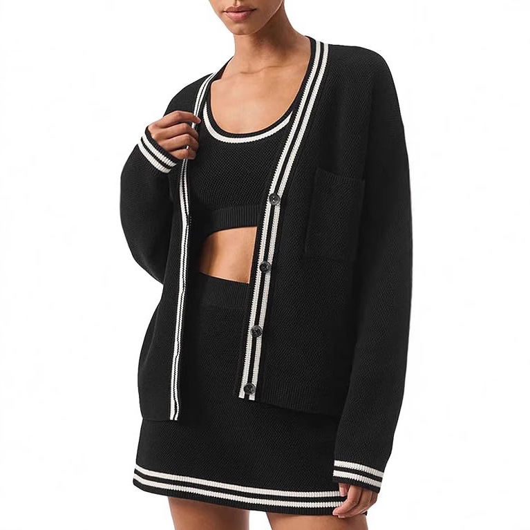 Главная страница > Новый женский кардиган для внешней торговли, однобортный вязаный жакет с длинными рукавами, цветной блокированный свитер с карманами, комплект кардиганов