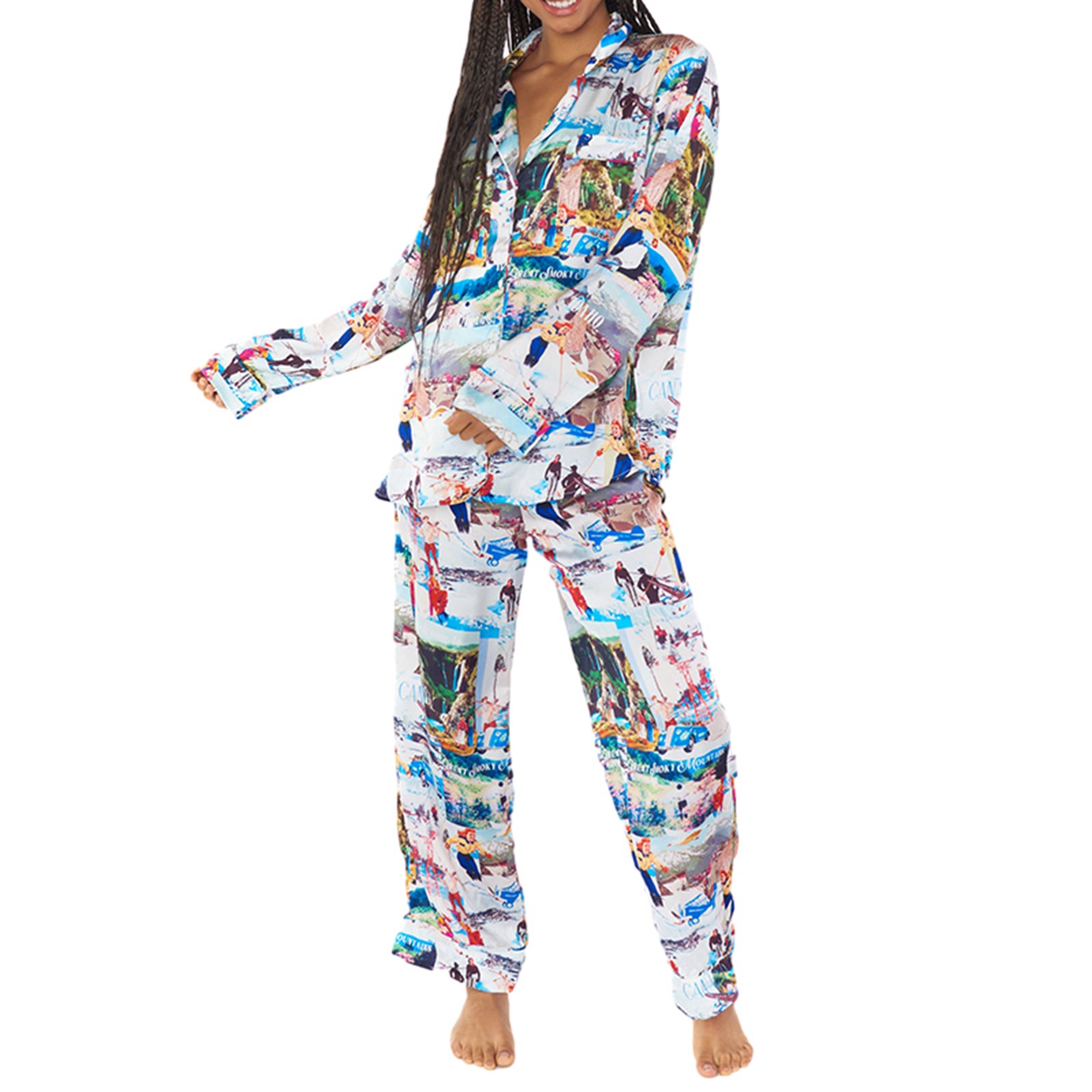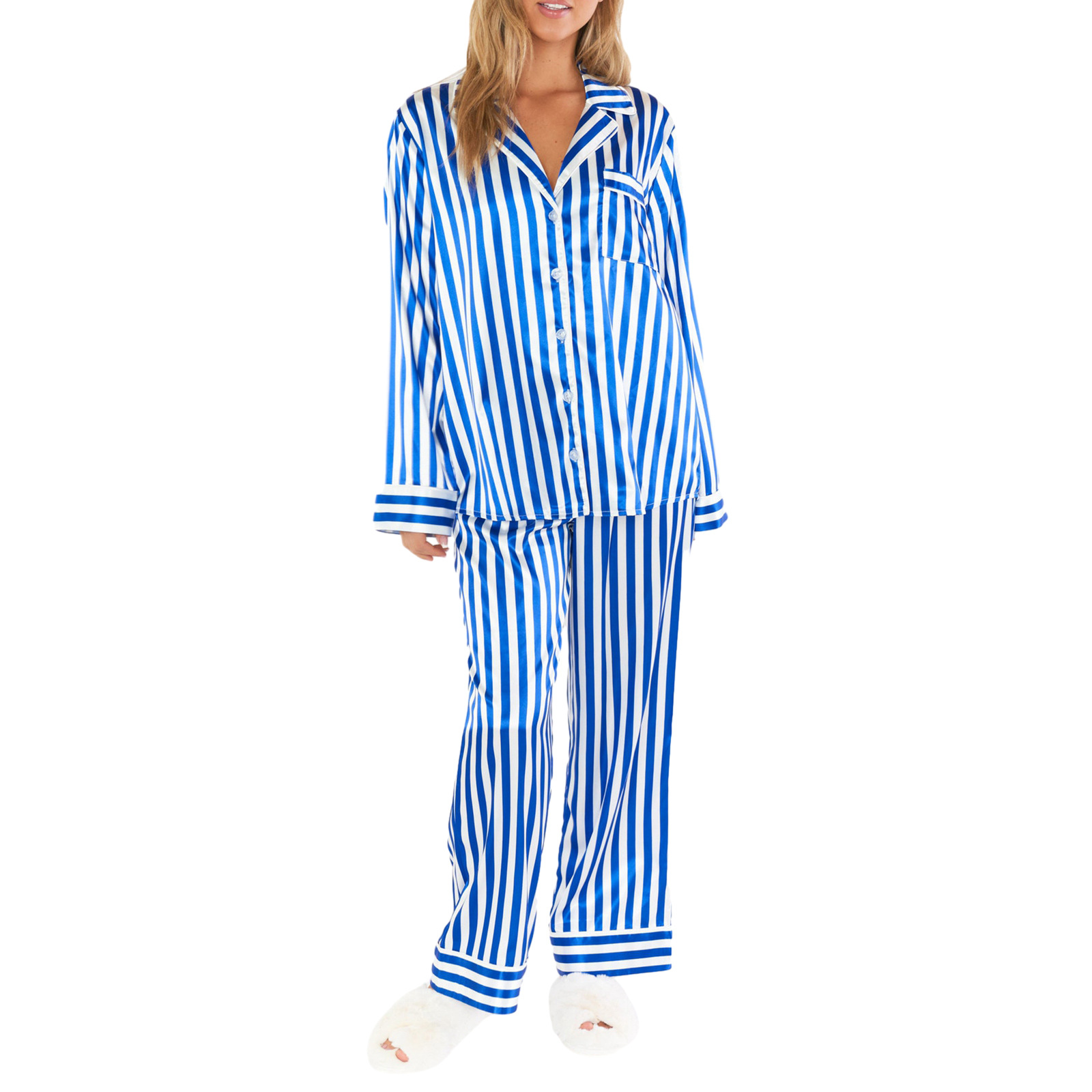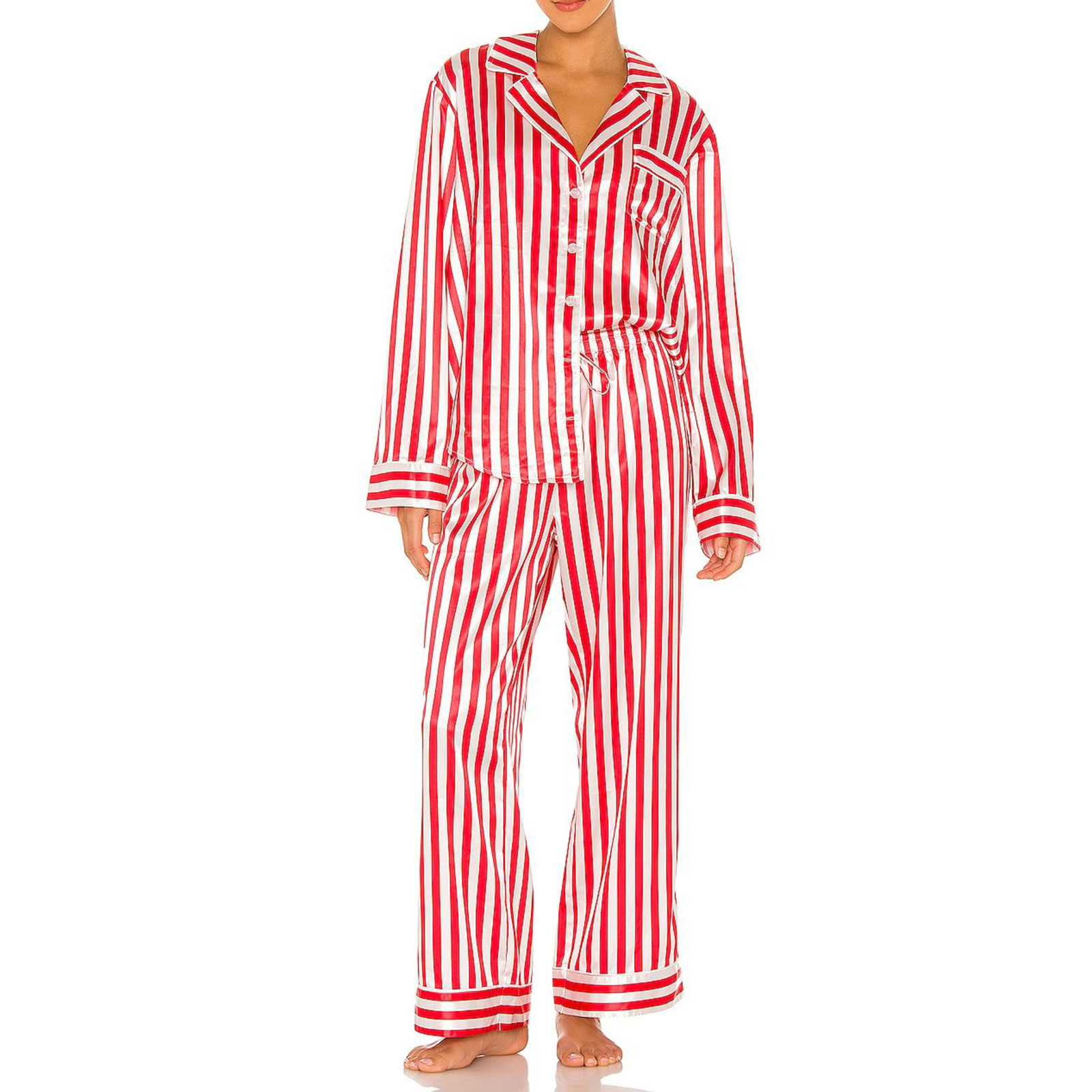 Главная страница > Трансграничная амазонка, европейская и американская женская одежда, имитация шелковый полосатый принт повседневный свободный костюм с воротником пижамы