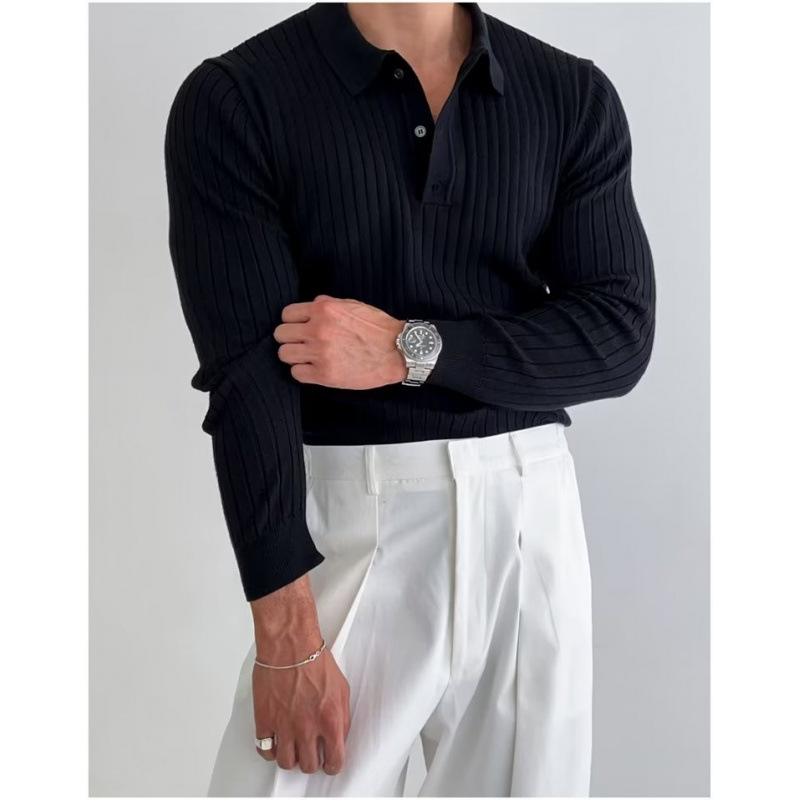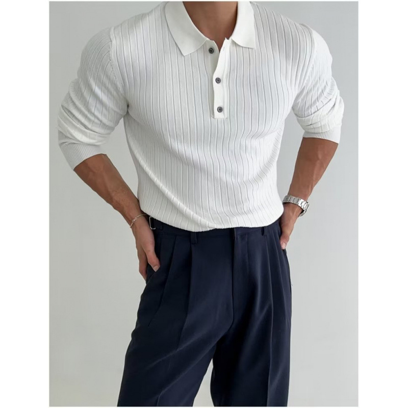 Главная страница > Мужская трикотажная рубашка-поло в полоску, новый весенне-осенний стиль, легкий деловой повседневный стиль, универсальная, с отложным воротником, с длинным рукавом, свитер.
