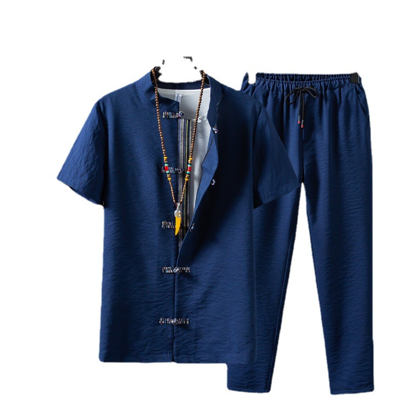 Главная страница > Летняя мужская хлопковая льняная футболка с короткими рукавами из ледяного шелка в китайском стиле, брюки больших размеров, повседневный однотонный костюм для мужчин