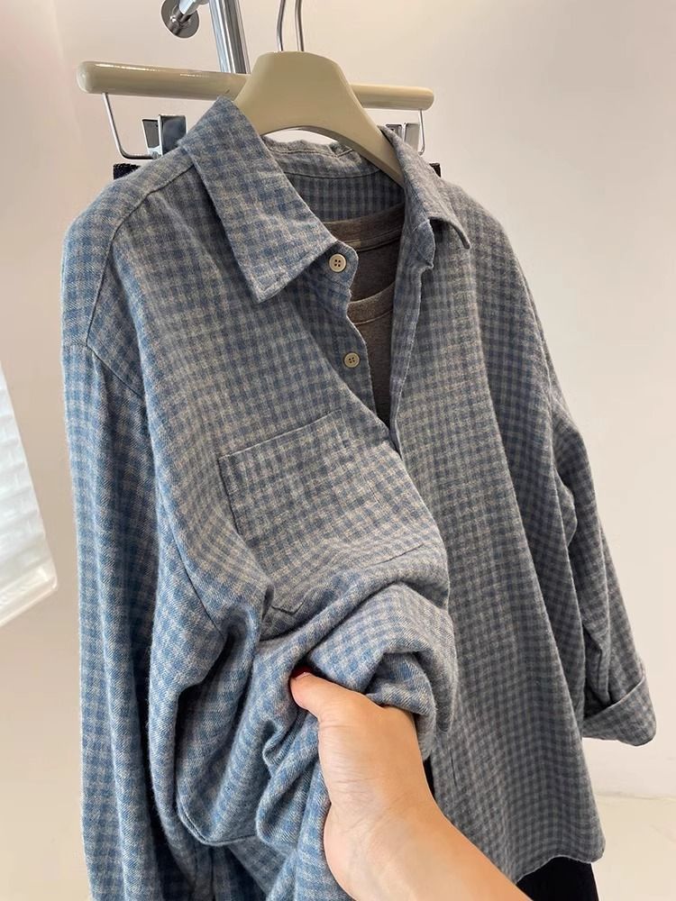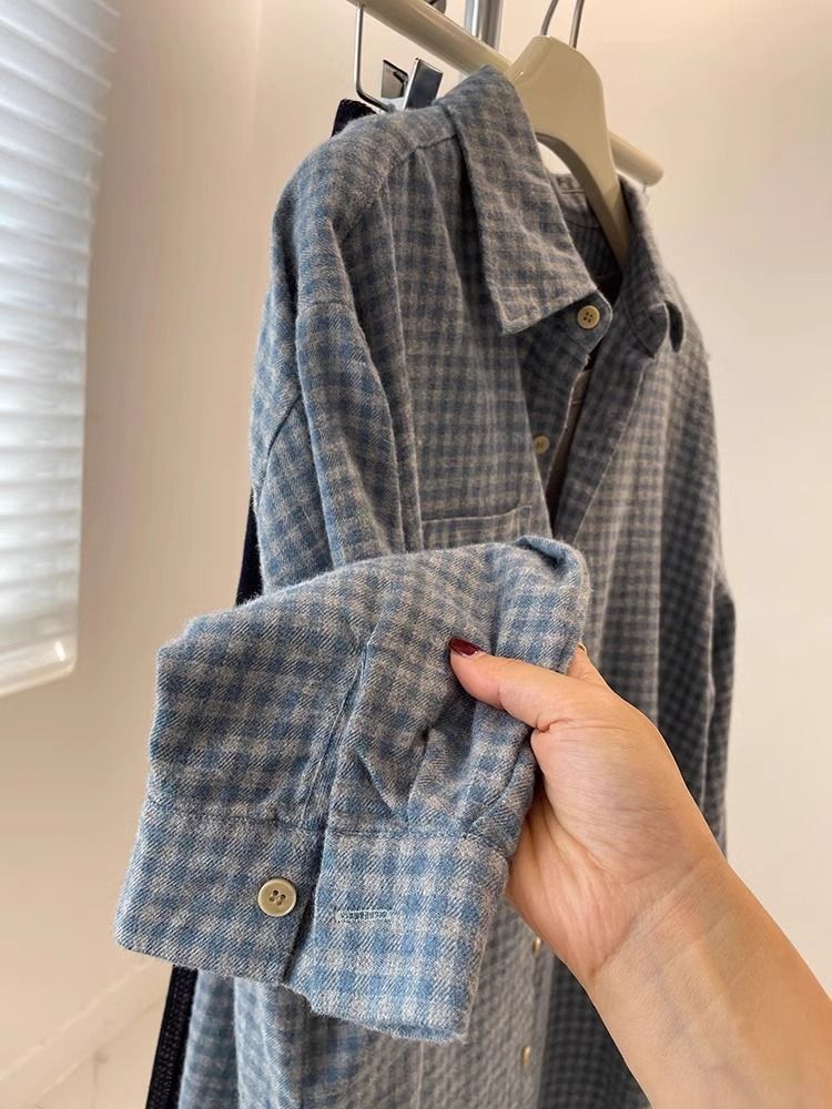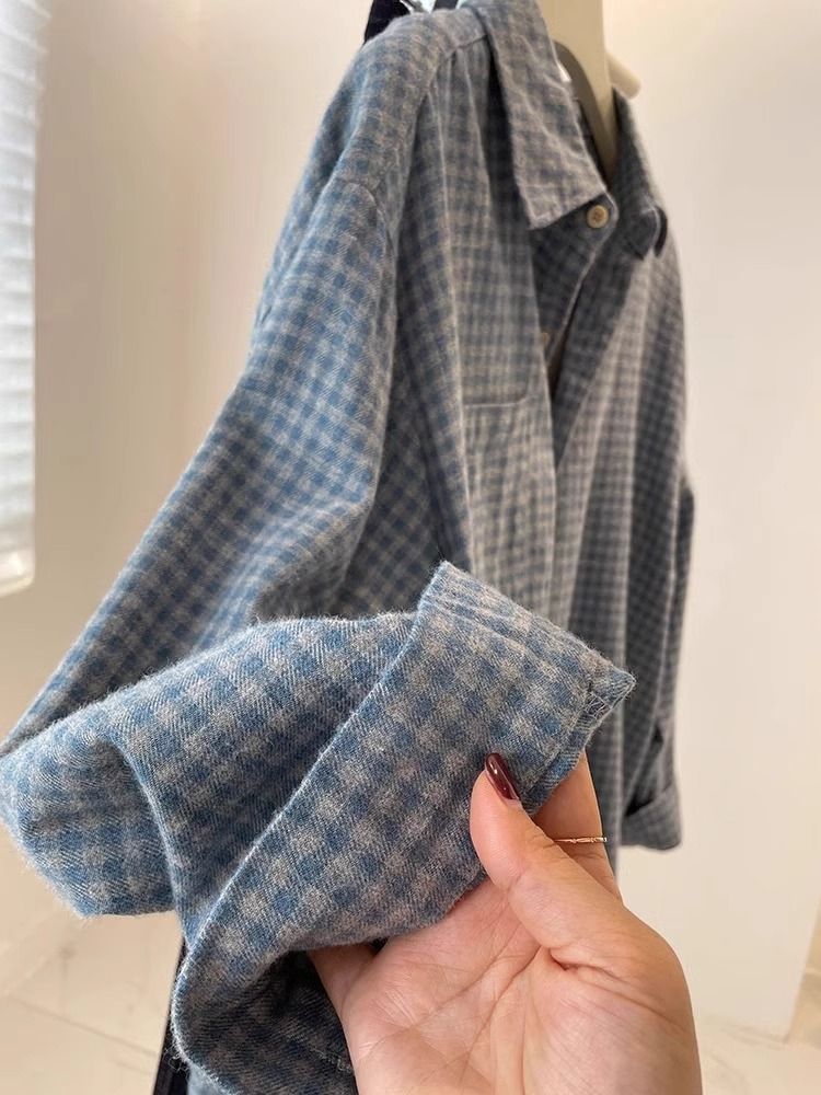 Главная страница > Корейская версия ретро-шлифовальной синей клетчатой рубашки с длинными рукавами женская весна и осень 2025 новый свободный ленивый топ