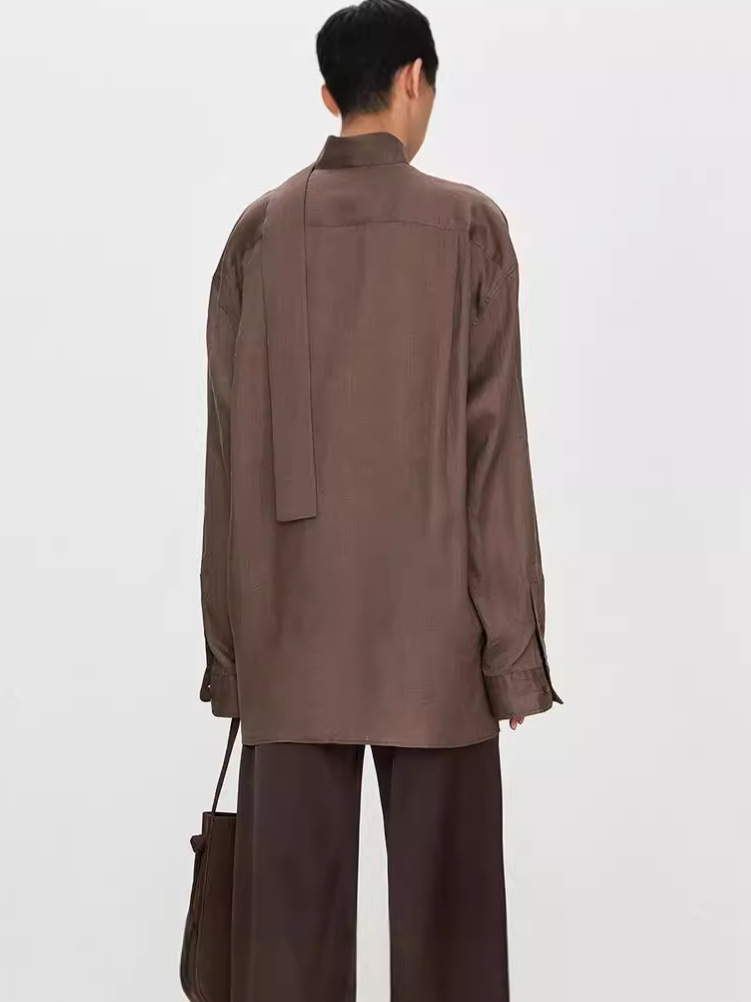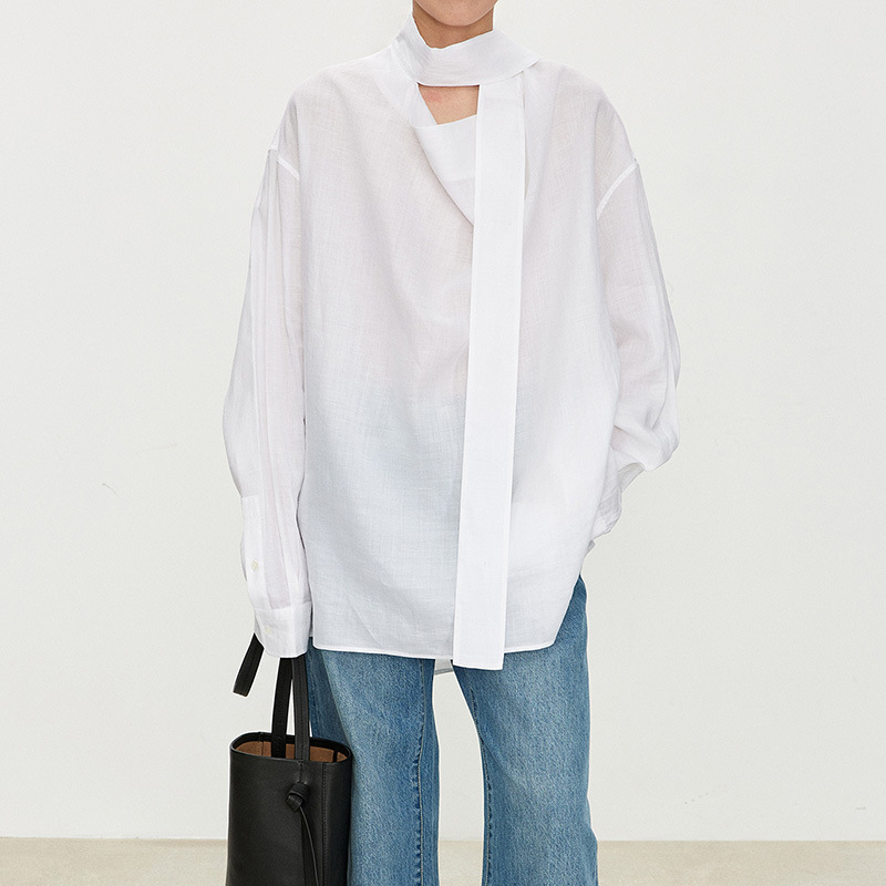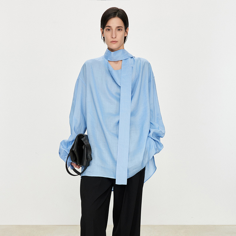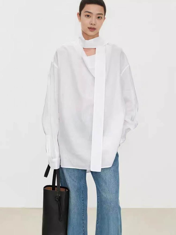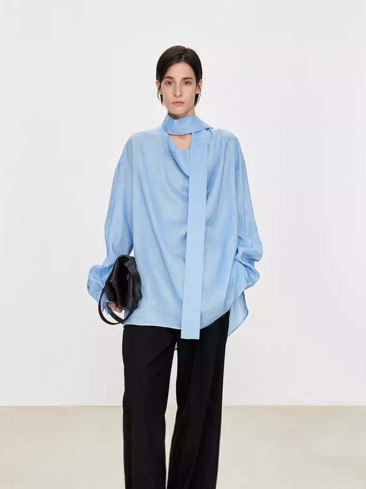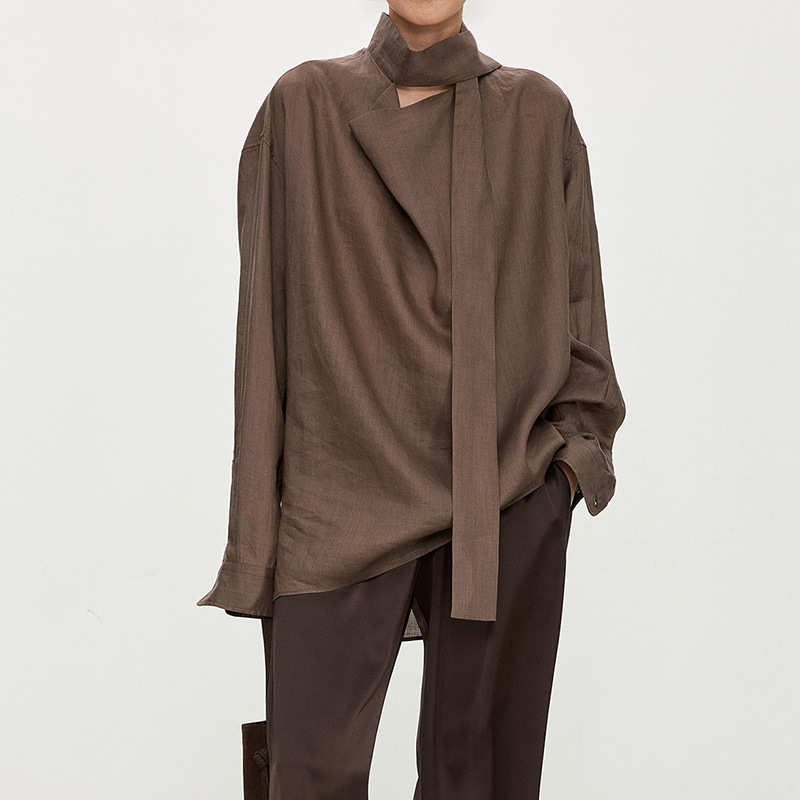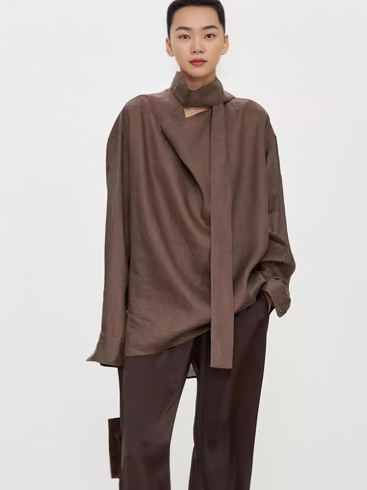 Главная страница > Женская рубашка из рами в стиле «старые деньги», осень 2025, нормкор, повседневный стиль, драпированный воротник, универсальная, с лентой