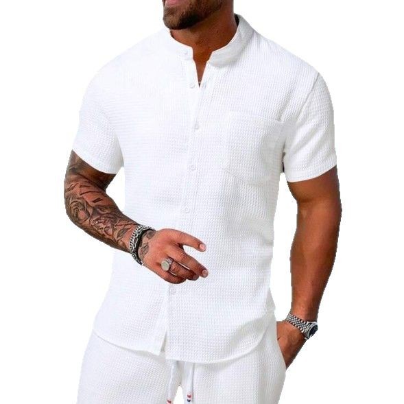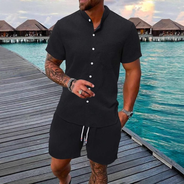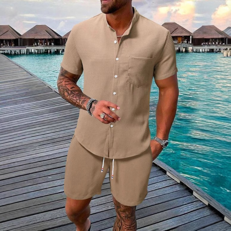 Главная страница > Летний комплект Amazon 2025: мужской повседневный набор из рубашки с коротким рукавом и шорт однотонного цвета