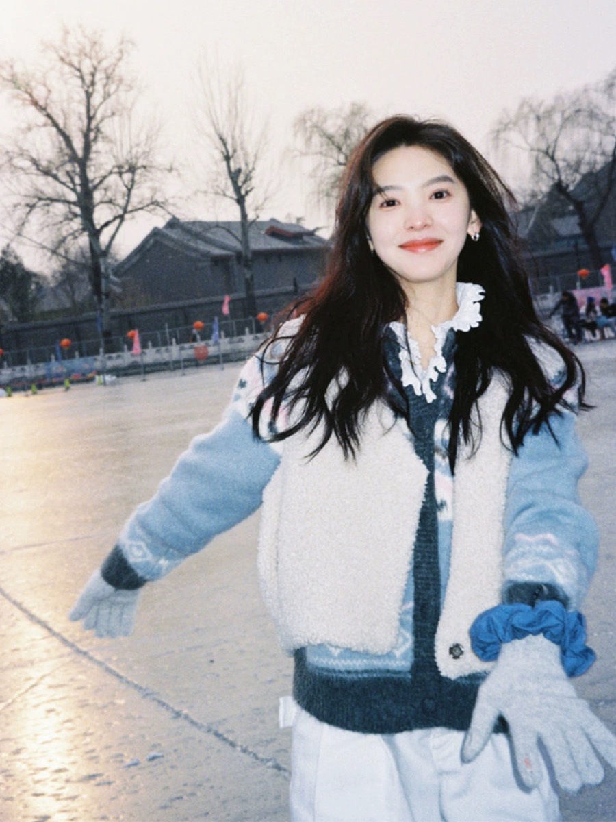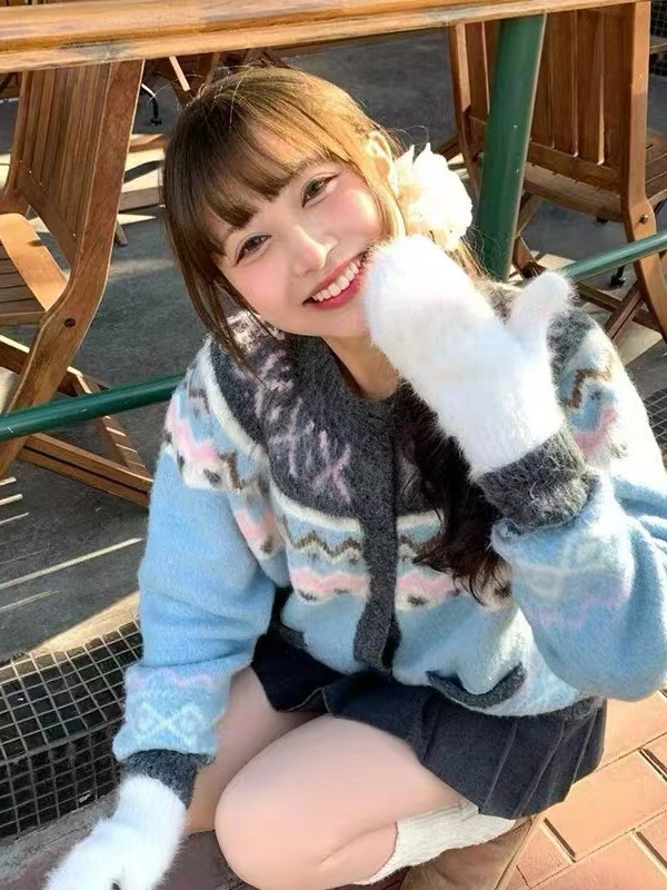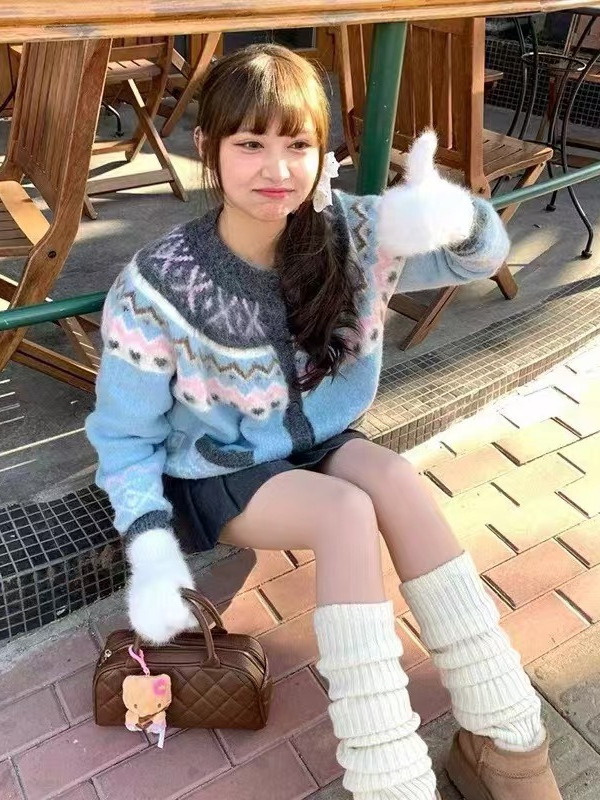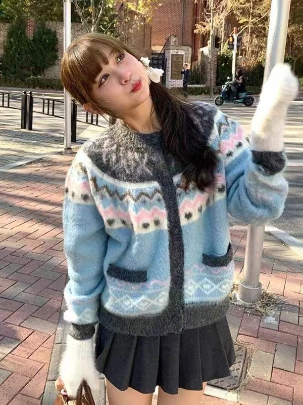 Главная страница > Чжан Руонан такой же ретро-синий жаккардовый короткий свитер женский милый топ трикотажный кардиган пальто зимой