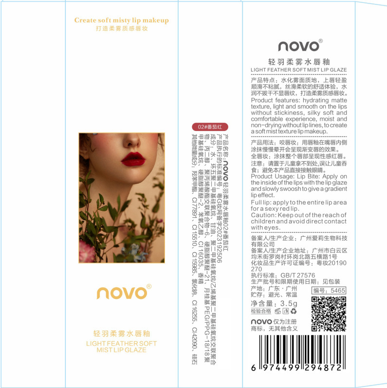 NOVO легкий перо и мягкий туман для губ, глазурная помада красная водяная легкая шелковая бархатная матовая поверхность, продолжительная цветная, студенческая вечеринка показывает ежедневный белый цвет