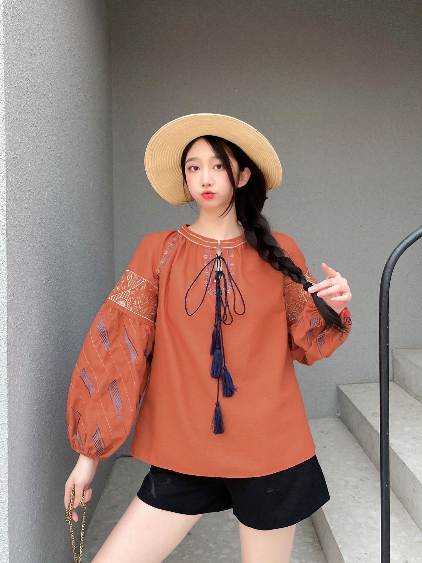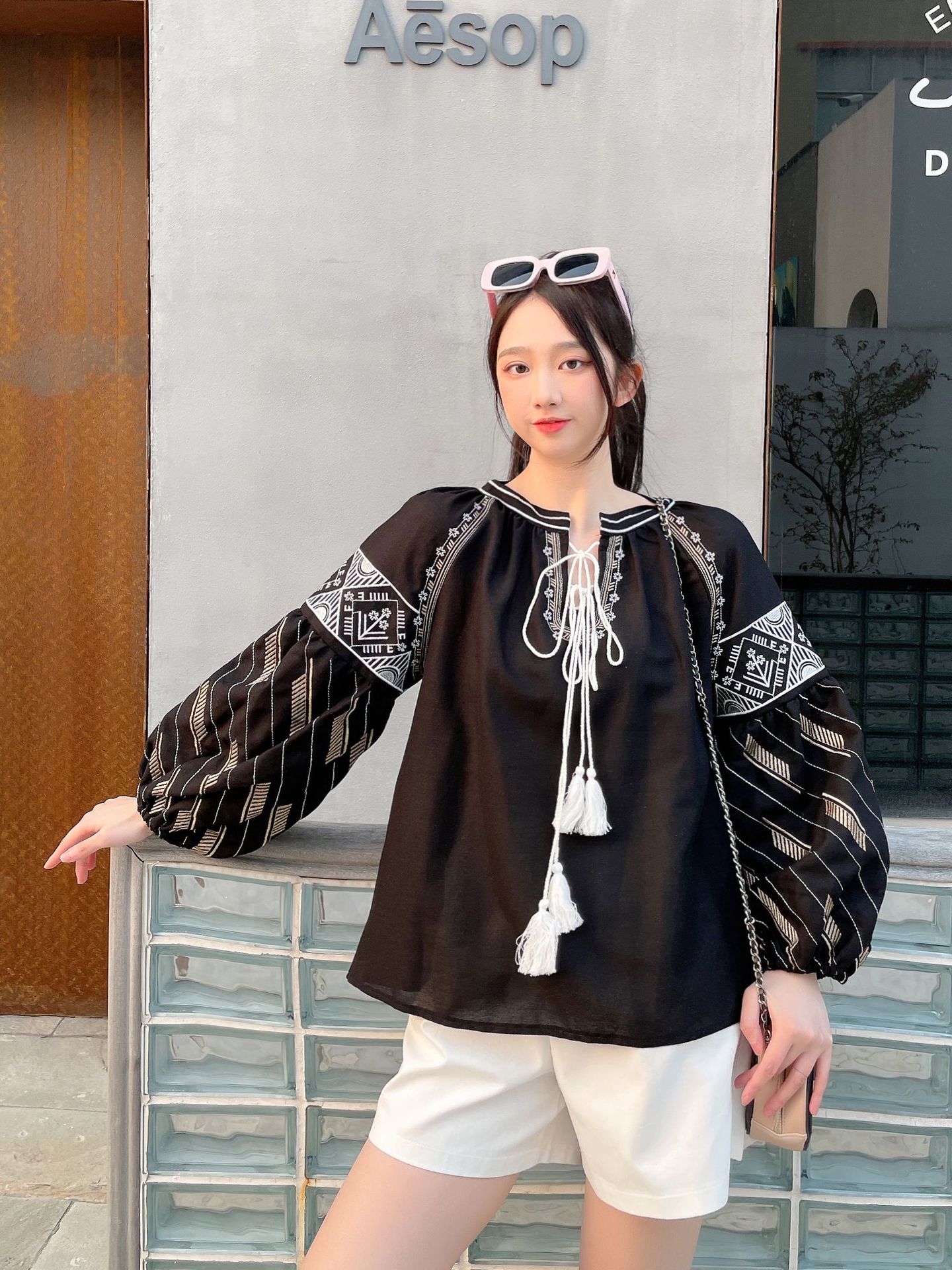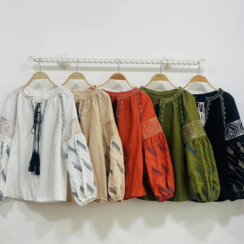 Главная страница > Весна и осень 2023 винтажный этнический фонарь с длинным рукавом, Свободный пуловер с V-образным вырезом и вышивкой, женский топ в западном стиле