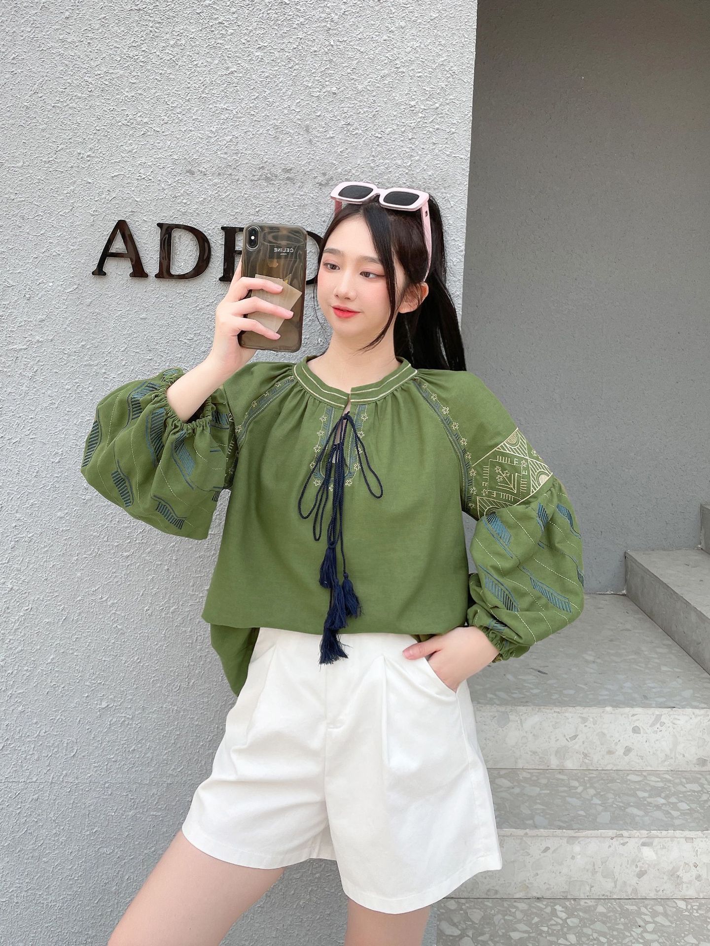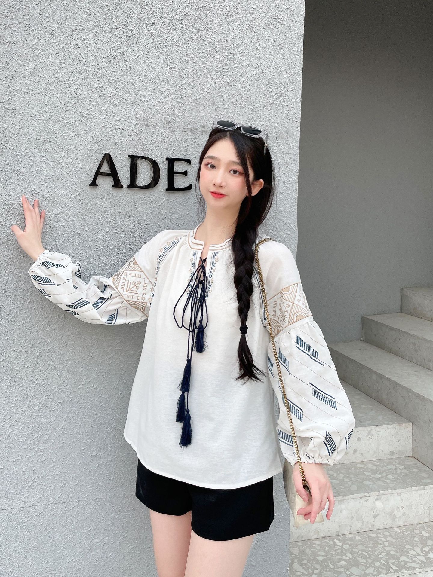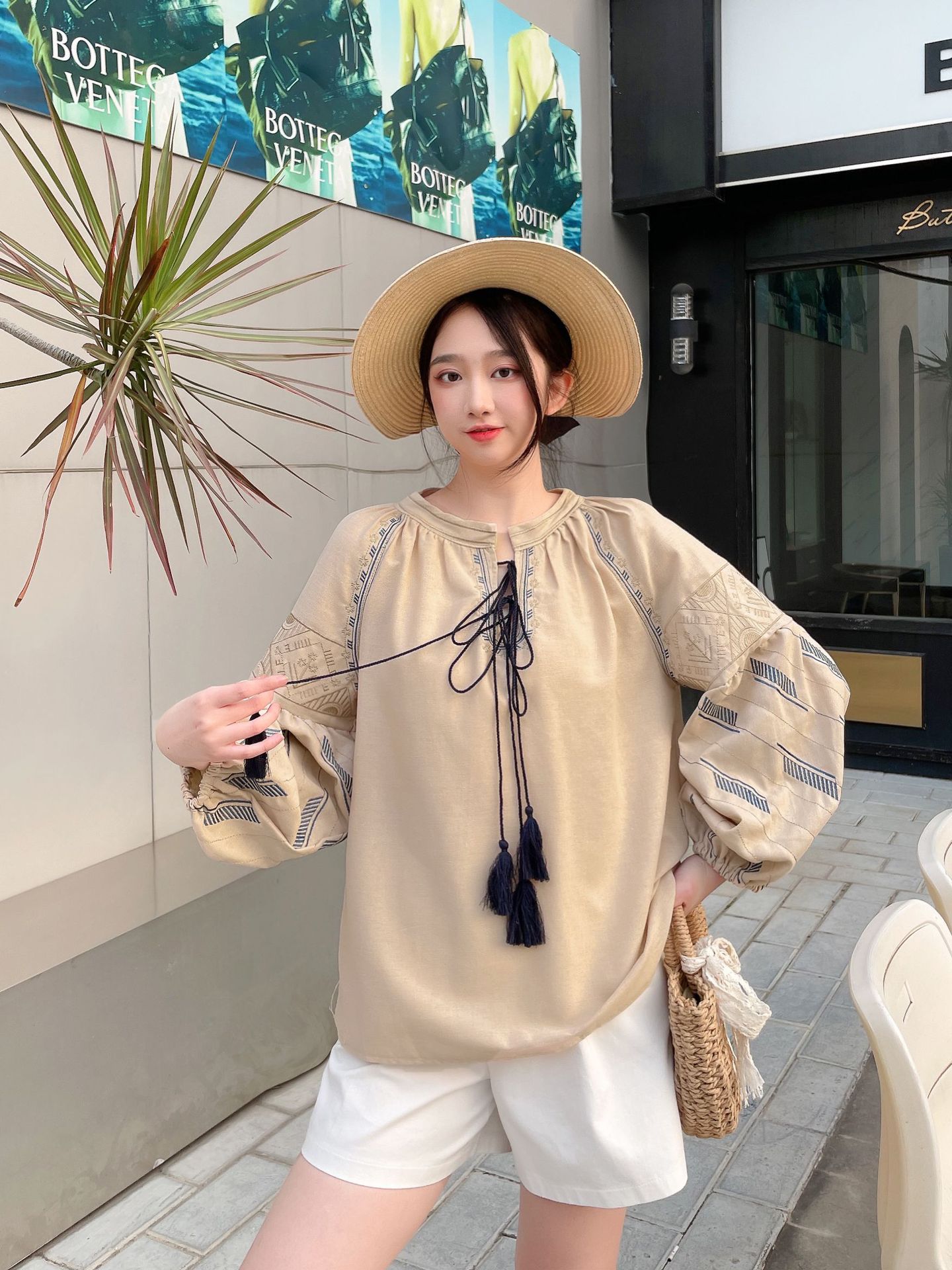 Главная страница > Весна и осень 2023 винтажный этнический фонарь с длинным рукавом, Свободный пуловер с V-образным вырезом и вышивкой, женский топ в западном стиле