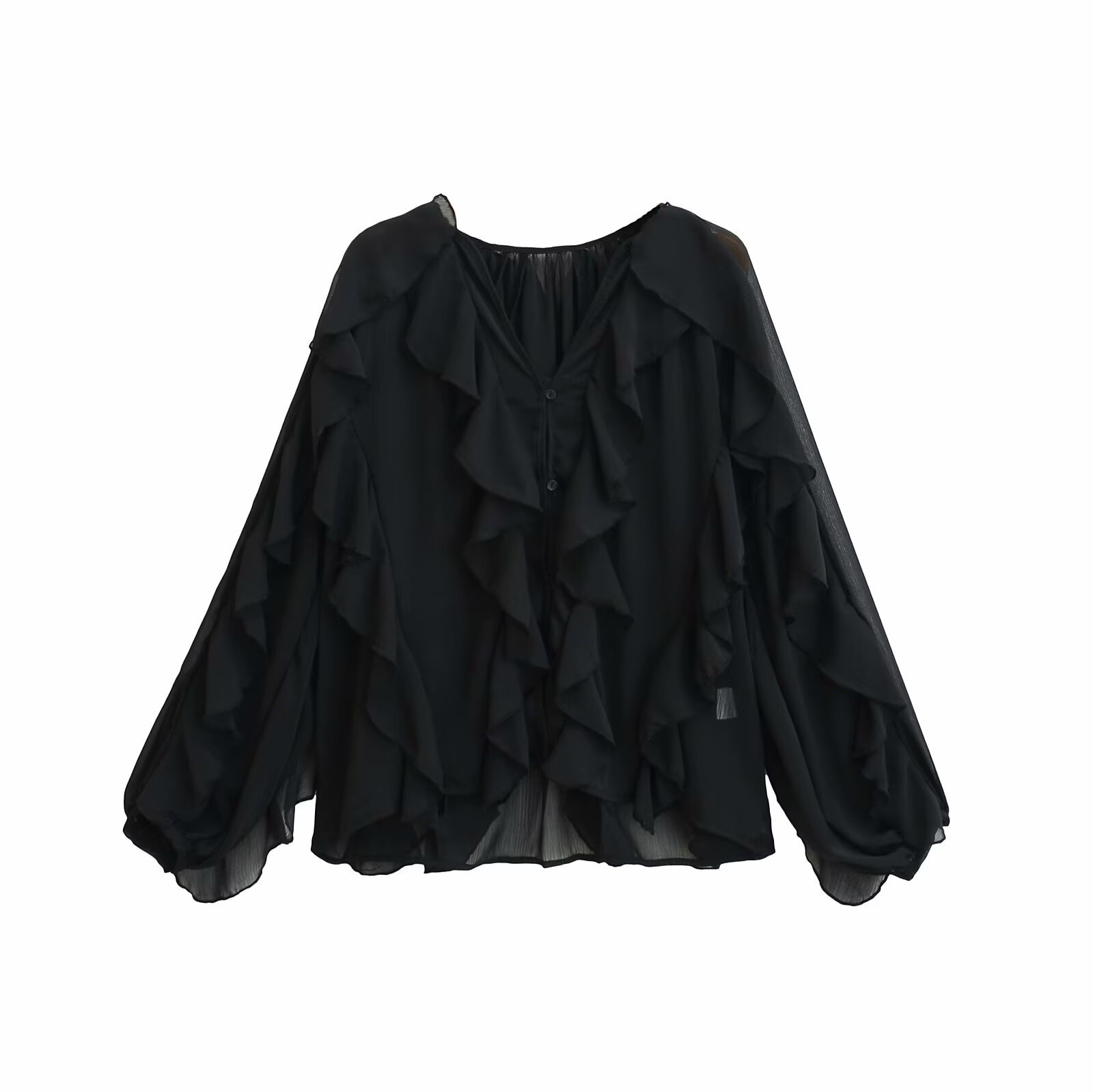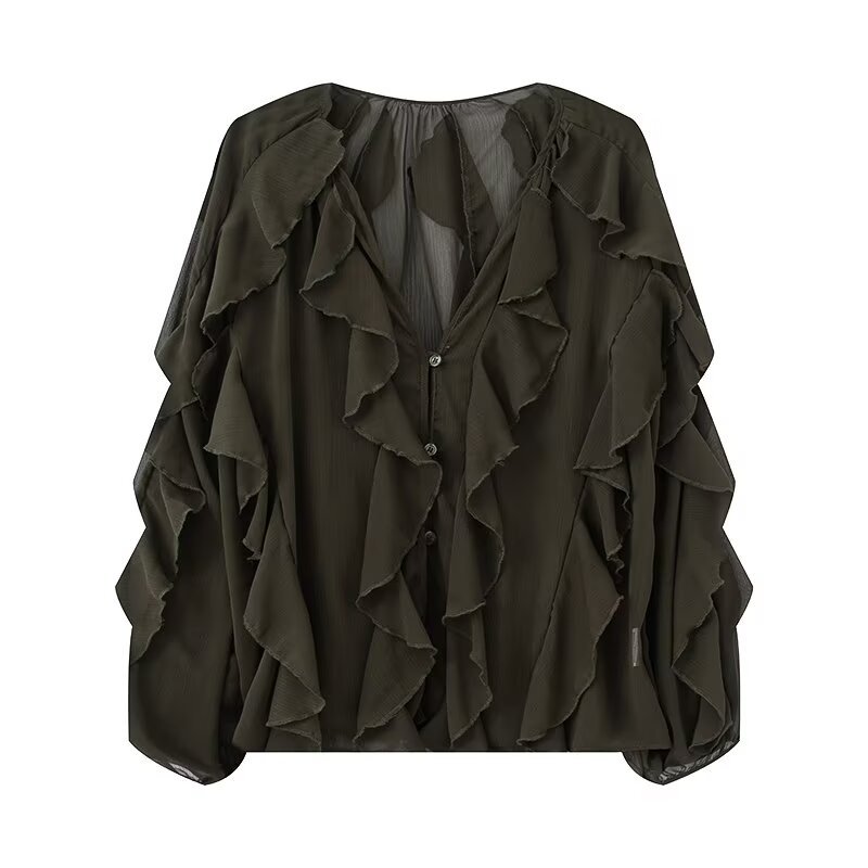 Главная страница > Внешняя торговля оптом 2025 лето в европейском и американском стиле мода V-образный вырез декоративные рубашки с рюшами женские D16690/91