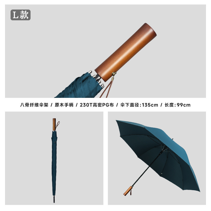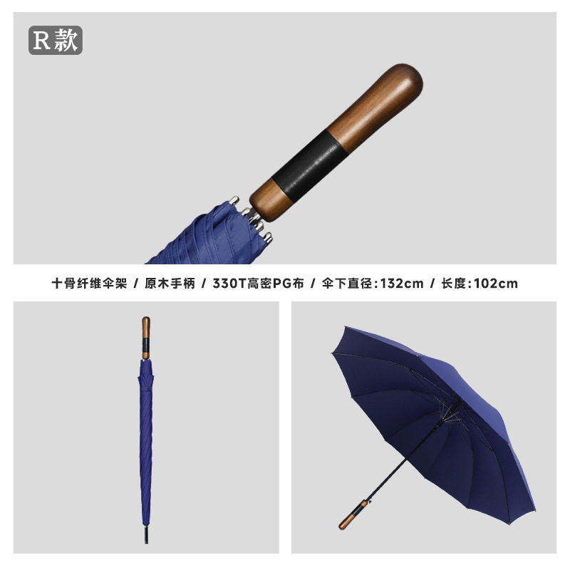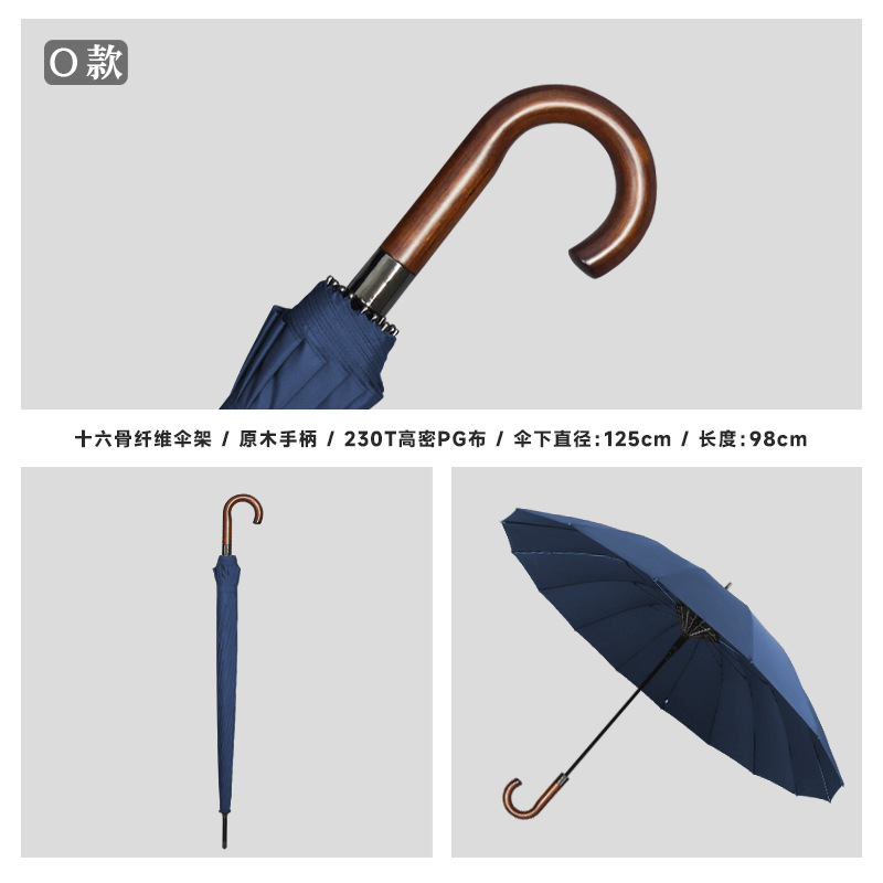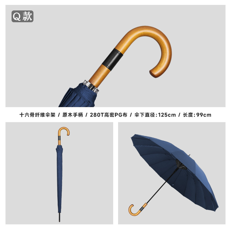 27-дюймовый, 16-ребристый, премиальный деревянный зонт с изогнутой ручкой — темно-синий