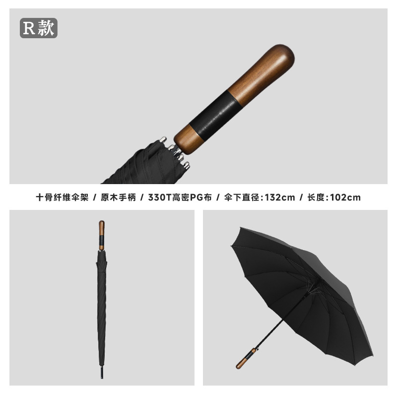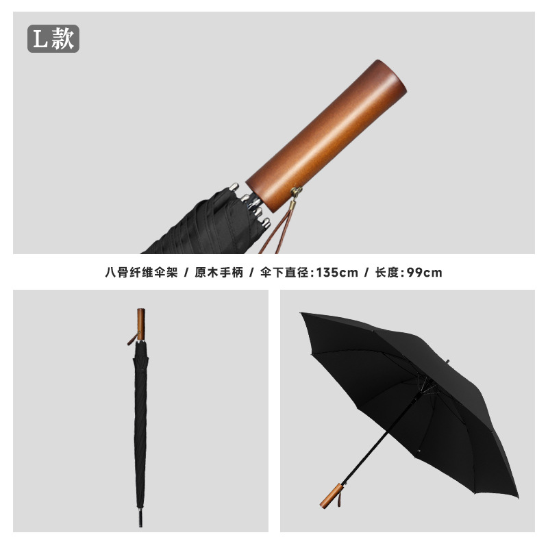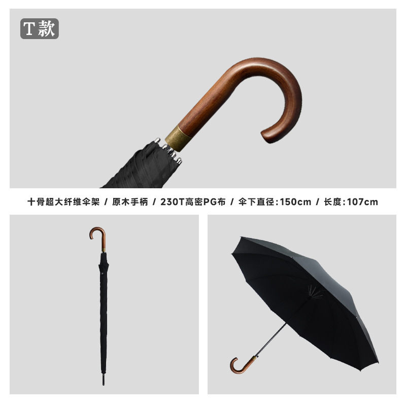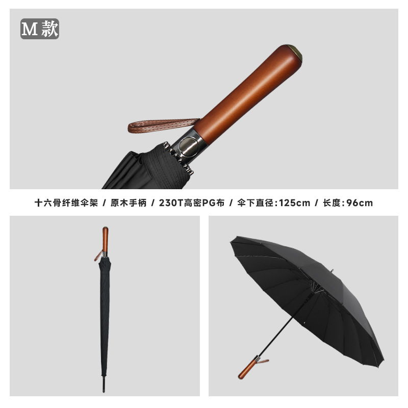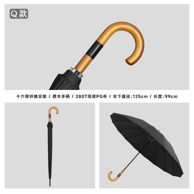27-дюймовый, 16-ребристый, премиальный деревянный зонт с прямой ручкой — черный