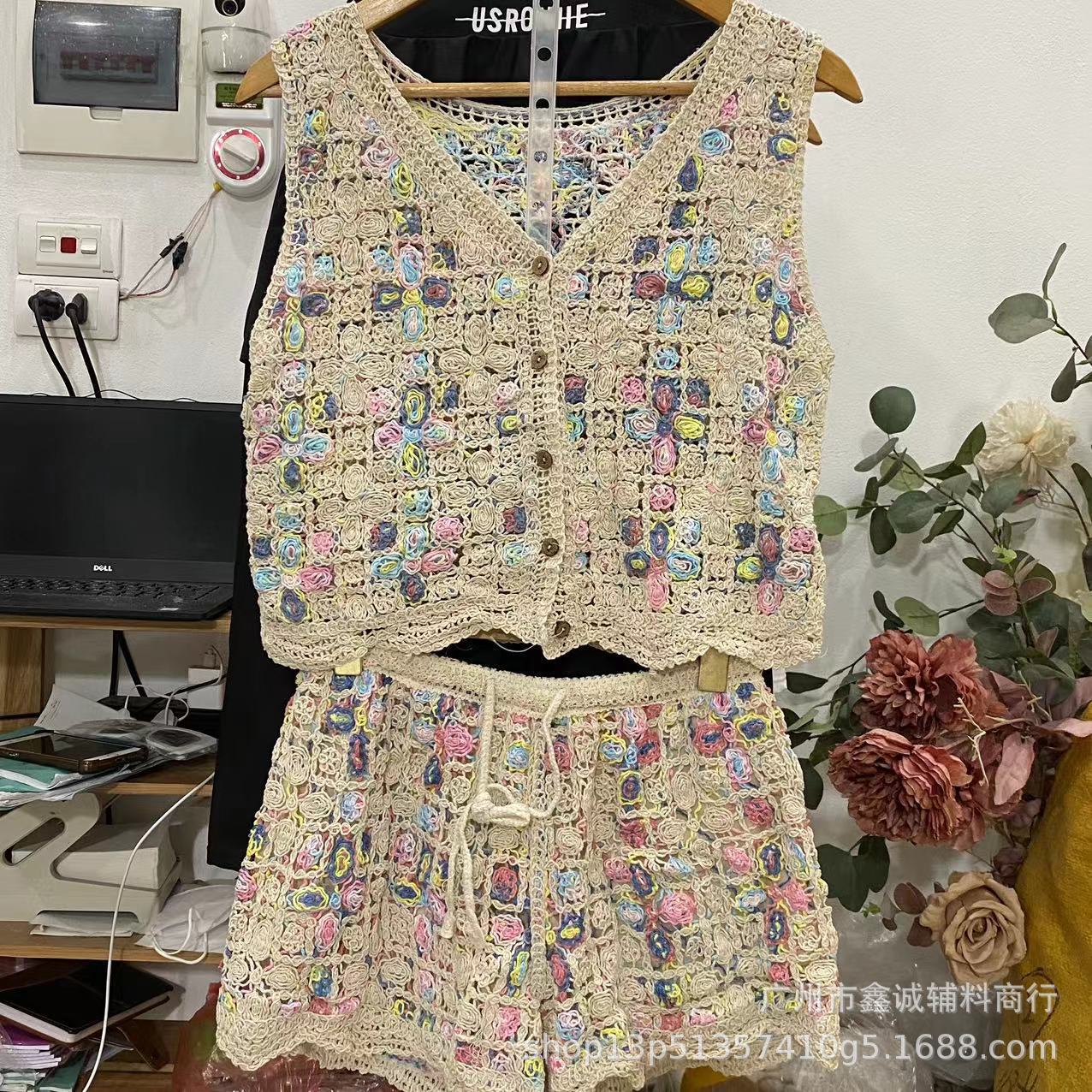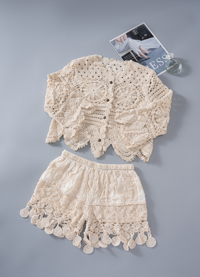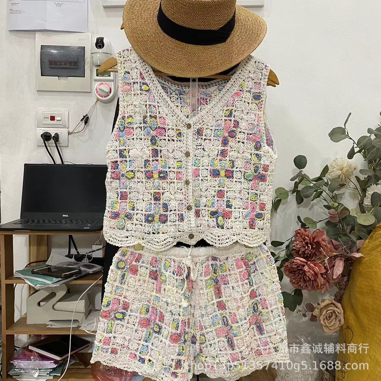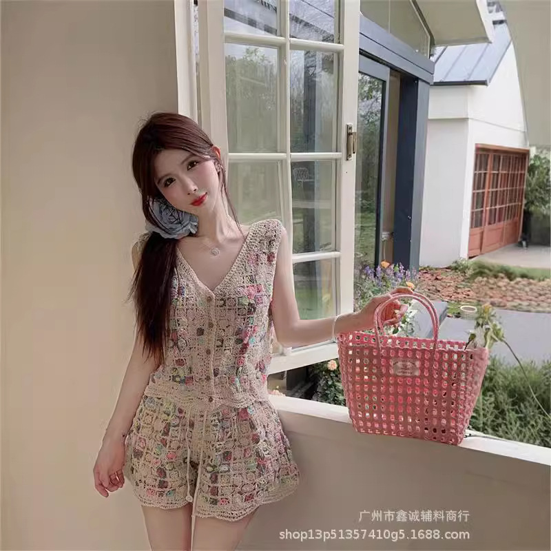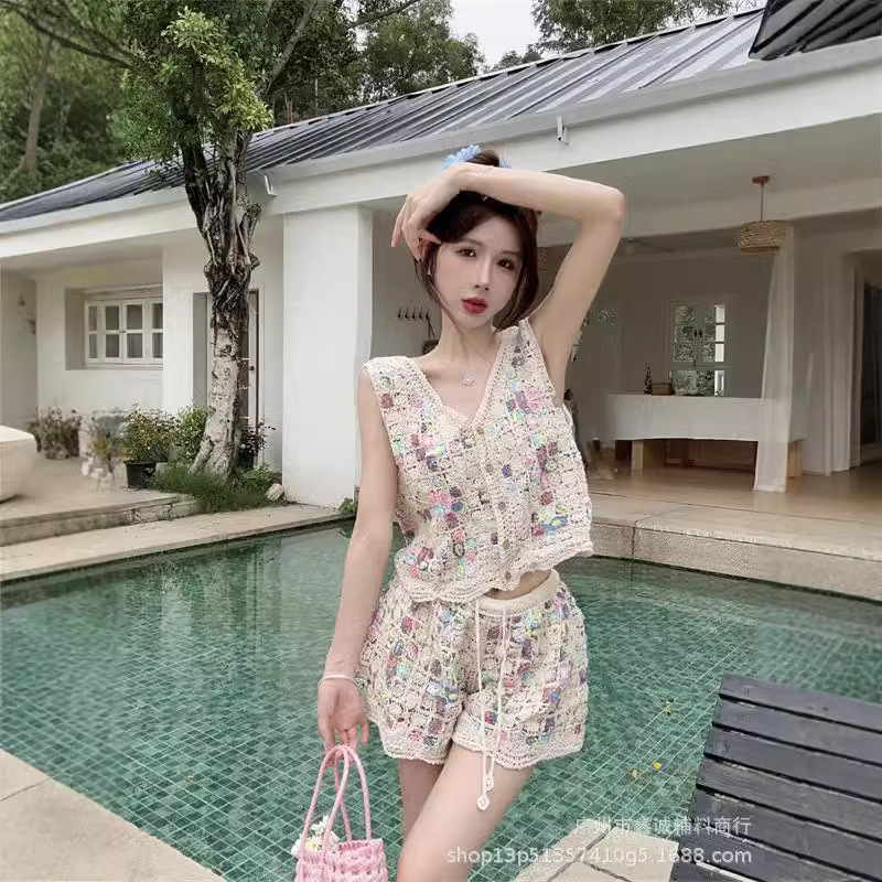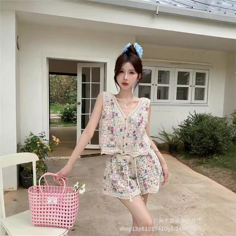 Японская корейская версия трикотажного набора с полым крючком женский летний сладкий квадратный воротник камзол жилет широкие шорты из двух частей