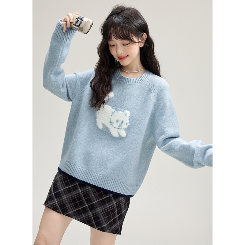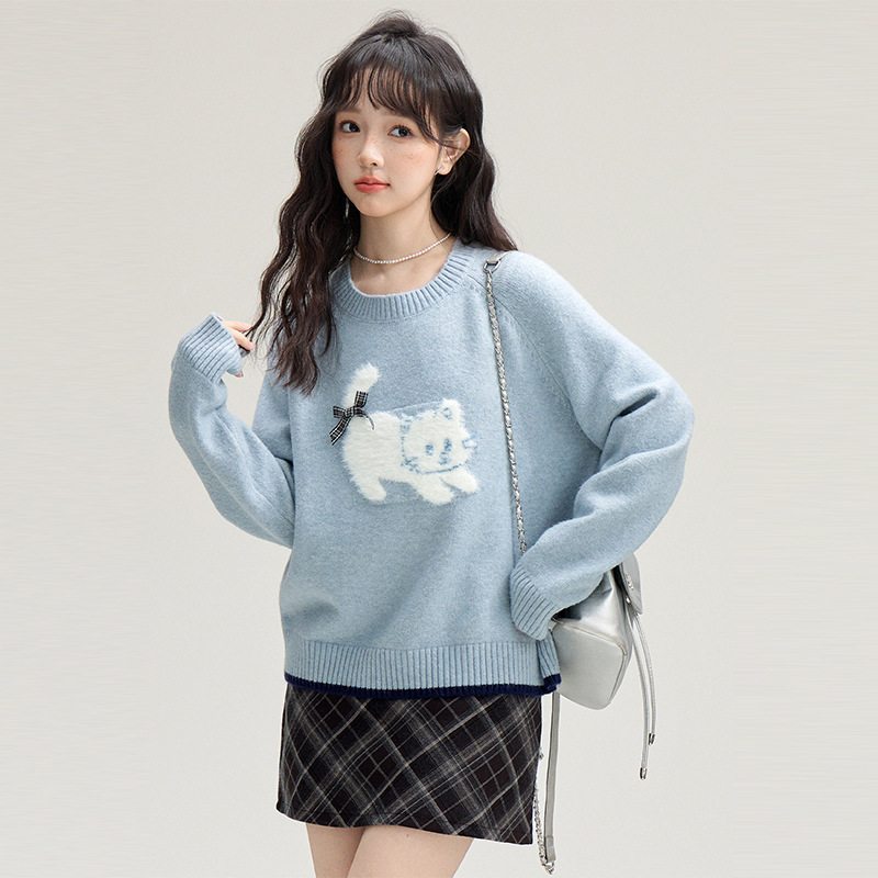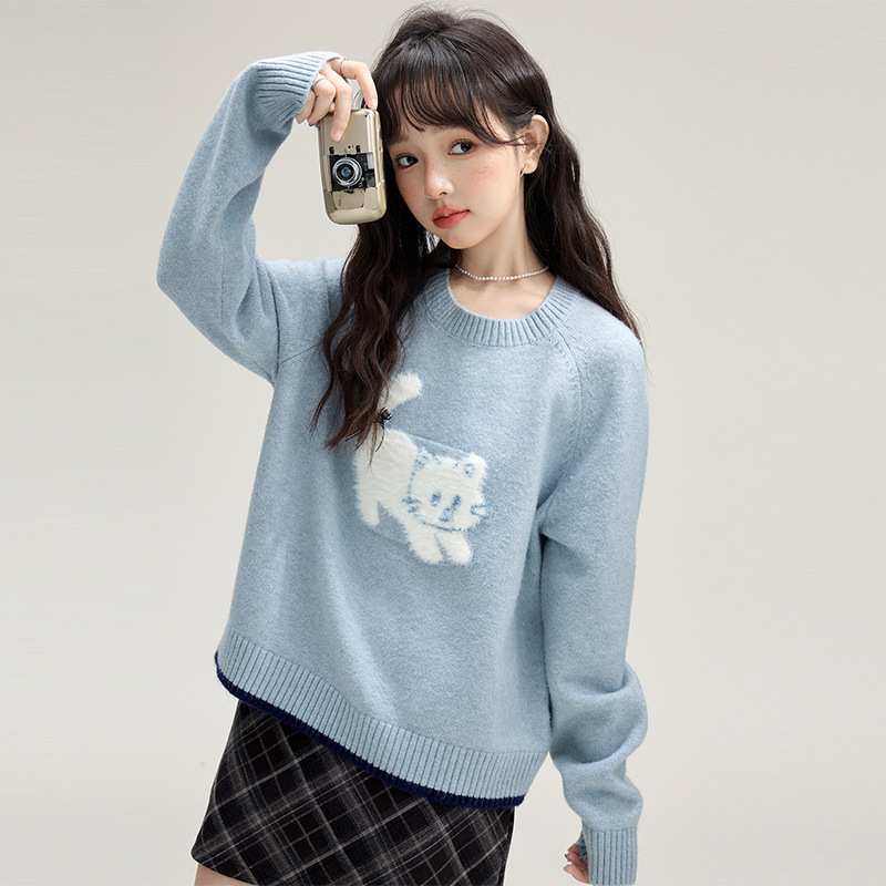 Главная страница > Синий свитер с круглым вырезом женский осень и зима 2024 новый дизайн свободный стерео бант свитер топ