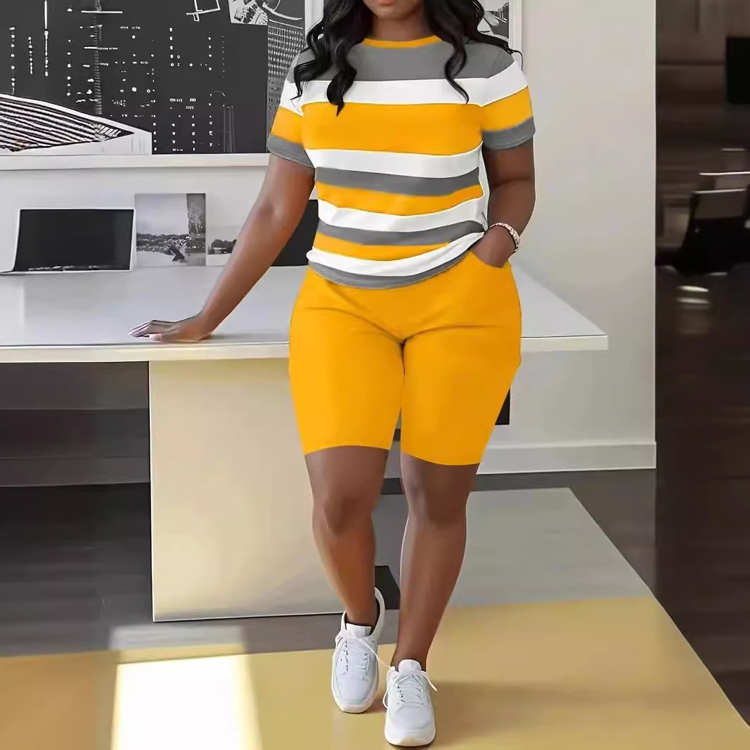 Главная страница > Трансграничный европейский и американский женский костюм больших размеров, полосатый пуловер, шорты с короткими рукавами и 3D принтом, костюм